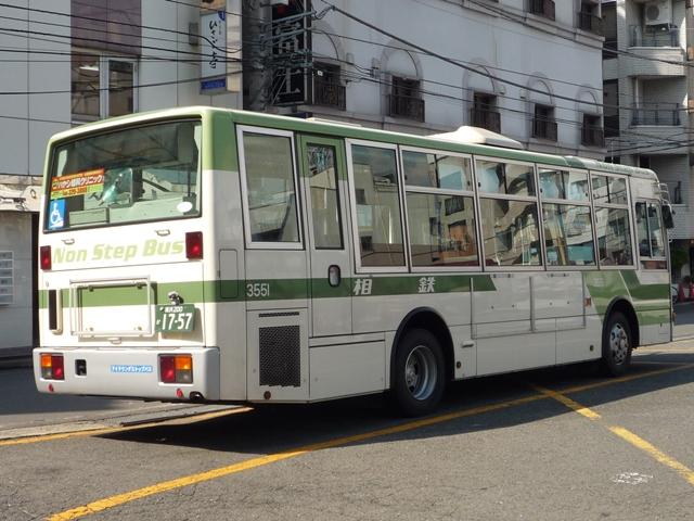 バス事業の分社を巡ってここ数年労使間の対立が見られた相模鉄道。実際にストライキ も起き、バス事業の分社化は凍結状態にありました。そこで相模鉄道は鉄道事業を分社 化するというコペルニクス的転換でこの問題を解決しました。冒頭の感想は、このニュー スを知ったときの小生のつぶやきです。 鉄道事業を分社した相模鉄道本体は相鉄ホールディングスと改称し、字的に持株会社の ようにも見えますが、バス事業も運営するという、なんとも複雑な存在となりました。 社番:3551. 相鉄ホールディングスに変わったといっても、緑帯のカラーの車両に変化は見られず。 ちなみにこの車両は最近までラッピング広告車だった関係からか、後部側面にあるはずの グループマークとロゴがありません。 社番:3558. ラッピング車もご覧の通り。 社番:1257. 大型車もこんな感じ。 むしろ気になるのは、小豆色カラーの復刻旧塗装の車両なんですが・・・、求情報。