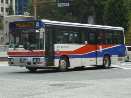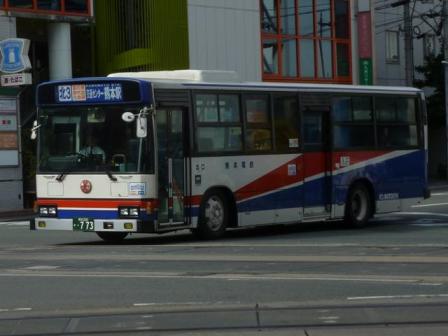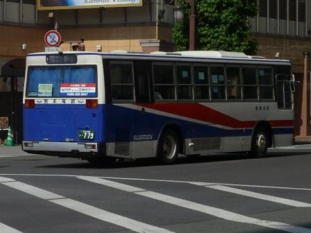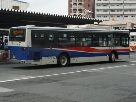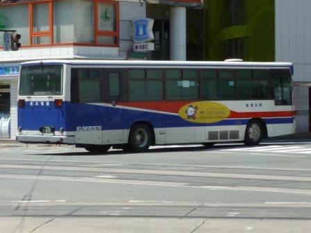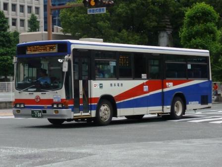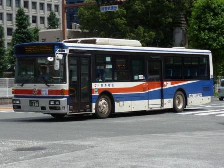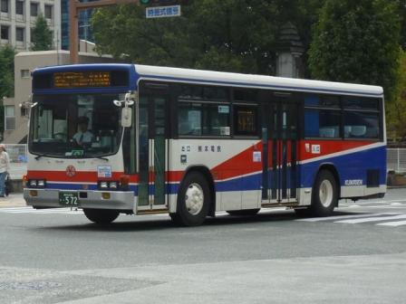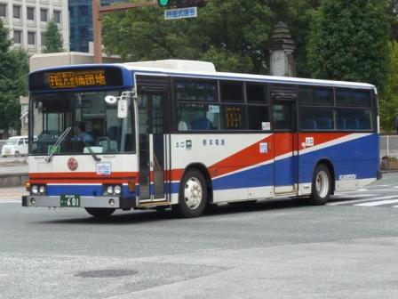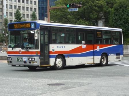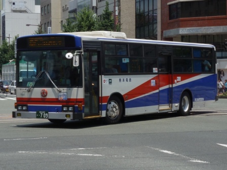 「熊本で見たバス2013」と題したバス画像のよせ集め。 約1ヶ月ぶりとなる熊本電鉄編です。今回のその2では、2011年編で並べられなかった 熊本200か500~700番代の一般乗合車画像を中心にまとめていきます。重複している 車両も結構ありますが、そこはご勘弁願います。 なお、ノンステップバスの型式は『バスラマインターナショナル』各号掲載の「ノンステップバ ス事業者別累計」を参照しています。 熊本200か520.PB-RM360GAN(07年車)。 まずは2011年編で並べていなかったPB規制車のRMノンステップ。シビリアンテールが ポイントです。熊本電鉄では一時期自社発注のノンステップ車・ワンステップ車を黄一色の いわゆるアイミー塗装としていましたが、この車両は標準塗装で登場。 熊本交通センターを発着する熊本電鉄のバス路線は大型車及び中型幅の10.5m低床車 をメインとしていますが、熊本市交通局から移譲を受けた高平団地線は一部狭隘な区間を 走行することから中型車専用路線となっています。 熊本200か547. せっかくなので高平団地線で運用されることの多い中型車をもう1台。こちらは中扉4枚折戸で スロープ無し仕様のいすゞLRワンステップ車。神戸市交通局からの移籍車で、画像の車両含め 2台在籍しています。車内は注意喚起のプレートなど、神戸市交通局時代の名残を色濃く残します。 熊本200か572. 純正キュービックボディのいすずLVツーステップ車は国際興業バスからの移籍車。 1台のみの在籍で、なおかつ中扉が自社発注車同様4枚折戸仕様となっていることから違和 感なく溶け込んでいる印象。 熊本200か601. 全国で移籍事例が見られる京浜急行バスからの移籍車。熊本でも大人気で、とりわけ熊本 電鉄は日野HTワンステップ車をコンスタントに導入しています。画像の車両は丸目ヘッドライ トのU規制車。 熊本200か607.PKG-KV234N2(08年車)。 移籍車大量導入のなか、西工ボディの日野KVノンステップ車1台を新車導入。前年導入の RMノンステップ車同様、アイミーカラーではなく標準塗装を採用。 今のところ、この車両が熊本電鉄最後の一般乗合新車となっています 熊本200か652. 京浜急行バスからの移籍車導入がコンスタントに続くなか、新たな移籍元事業者として高 槻市交通部が加わります。西工ボディのいすゞLVワンステップスロープ付車がまとまった 台数導入されました。 高槻市交通部は近畿圏の公営バスでいち早く前中扉仕様のワンステップ車を標準採用し たこともあり、移籍車市場で近年人気急上昇となりました。 熊本200か659. 同じく高槻市交通部からのいすゞLV移籍車ですが、この車両の正面に社紋がありません。 その後登場した車両には社紋が取り付けられていることから、たまたま廃車の再利用品が 無かったものと推測。このあたりのアバウトさが移籍車らしいところ。 熊本200か708. 京浜急行バスからの移籍車では初導入となるキュービックボディのいすゞLVワンステップ車。 1台のみの在籍。 熊本200か709. こちらはおなじみとなった京浜急行バスグループから日野ワンステップ移籍車。 ヘッドライトが角目となったことから、このあたりからKC規制車の導入となった模様。 熊本200か745. 中扉4枚折戸仕様の日野HTツーステップ車は3扉車以来の導入となる東武バスからの移籍 車。在籍台数は1台のみで、行先表示は久々の方向幕となっています。側面の小型幕から廃 車転用と推測。 熊本200か773. 京浜急行バスからの日野ワンステップ移籍車で、側面上部窓が拡大したタイプ。東武バス移 籍車同様、このあたりの導入車両は方向幕の行先表示となっています。 熊本200か779. 2011年編では前面からの画像だけだった三菱ふそうMPを、今回はリヤ側だけを並べて おきます。川崎市交通局移籍車で、1台のみの導入。 熊本電鉄では三菱ふそうの大型一般乗合車を西工ボディで導入していたため、いわゆる エアロスターMと呼ばれるボディはこの車両が唯一の存在。 PR