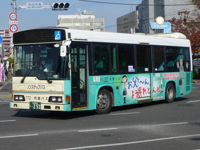 2014年11月に記録したバス画像のよせ集め「佐賀駅周辺で見たバス2014」シリーズ。 今回の佐賀市交通局編その2では、記録出来た01~08年に導入したノンステップ乗合車の画像を並べていきます。 なお、型式は『年鑑バスラマ』・『バスラマインターナショナル』各号掲載の「ノンステップバス導入一覧表」を参照しています。 車号:760.KL-HR1JNEE(01年車)。 佐賀市交通局初のノンステップ車として01年に2台導入した日野HR10.5mサイズ。外装は白1色で登場したため、黒ずみ汚れが目に付いてしまうのが残念。ラッピング広告準備車という扱いなのかもしれませんが、現在はなんとも中途半端な広告掲示状況です。 車号:766.KL-HR1JNEE(02年車)。 翌年導入車の外装は白1色ではなく、標準塗装で登場。 車号:770.KK-LR233J1改(02年車)。 02年秋には、UDのJPといすゞLRノンステップ車をそれぞれ1台導入。記録できたのは画像のLRのみ。佐賀市交通局の主力となる9mサイズにノンステップ車導入が開始となりました。 車号:772.KK-HR1JKEE(04年車)。 04年は日野HRを2台導入。HRは10.5mサイズと9mサイズが揃いました。 車号:776.PA-MK27FH(07年車)。 04年の日野HR導入後、交通局の民営化が取りざたされるなど様々な事から新車導入はしばらく見送りとなりました。佐賀市交通局の継続が決まり、07年に久々の新車として2台登場した三菱ふそうMKノンステップ車。 車号:778.PDG-RM820GAN(08年車)。 08年はUDのRMノンステップ車を2台導入。この頃はUDと三菱ふそうが国内バス販売事業の統合を目指していたこともあり、RMには三菱ふそう製エンジンを搭載しています。リヤ側の画像を記録出来なかったことが心残り。 PR ![]() ![]() |