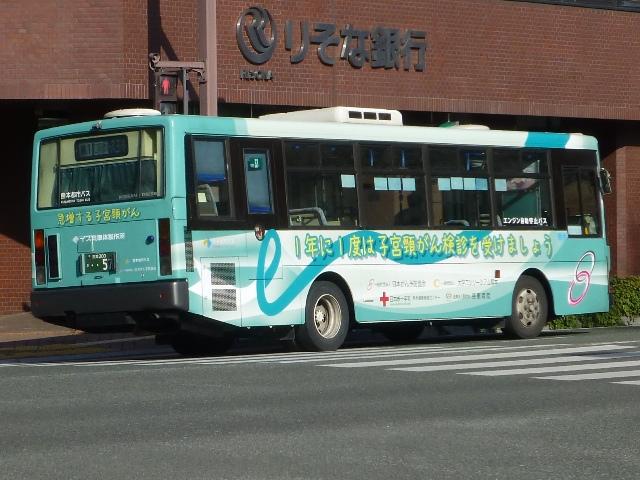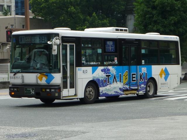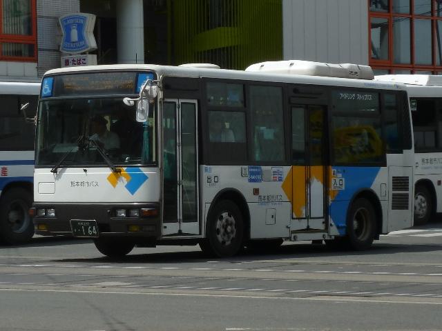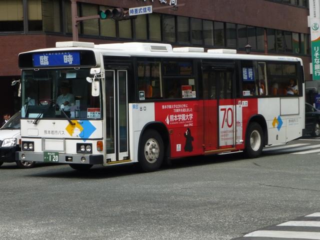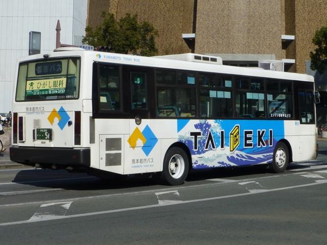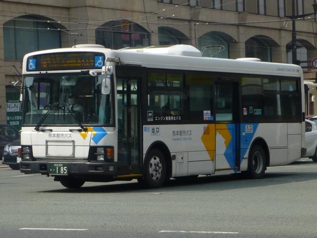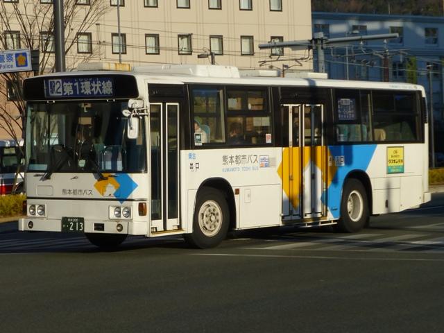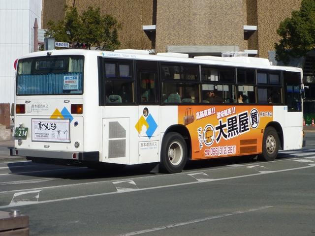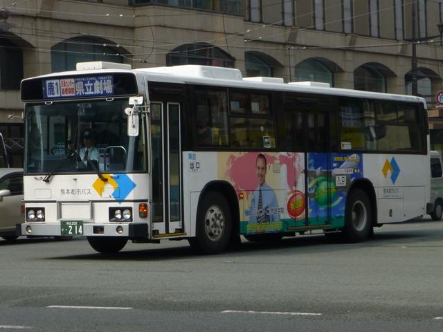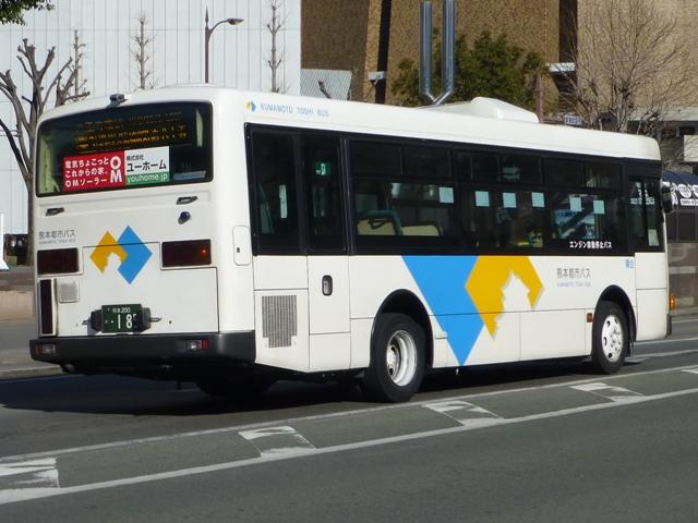 「熊本で見たバス2014-15」と題したバス画像のよせ集めシリーズ。2014年に記録した画像をメインに、多少2015年の画像も混ぜ込んでお送りしております。 前回の更新から少々あいだが開いた熊本都市バス編その3では、記録出来た熊本200かナンバー56から214とかなり中途半端なくくりの車両画像を並べていきます。なお、今回並べた画像の車両が既に代替されている可能性もあることをあらかじめお断りしておきます。 型式・年式は 「熊本市交通局・熊本都市バス在籍車両一覧表」『バスマガジン65号』,(2014),講談社ビーシー/講談社 を参照しました。 熊本200か56.KK-RM252GAN改(00年車)。 まずは熊本市営バスが00年に3台導入した西工スペースランナー顔ボディのRMノンステップ 車。中扉はグライドスライド仕様のトルコンAT車です。熊本都市バス運行開始時に、3台とも市営バスから転籍しています。 この車両は沿線のパチンコ屋「大劇(TAIGEKI)」のホイールベース間ラッピング広告車となっています。ホイールベース間ラッピング広告車の場合、側面の熊本都市バスロゴが後方に小さくデザインされます。 熊本200か57.KK-RM252GAN改(00年車)。 同じくRMノンステップ車ですが、こちらは2014年6月頃から子宮頸がん検診啓発の全面ラッピング車となっています。 熊本200か120.P-HU233BA改(90年車)。 熊本市営バスは熊本22かナンバー末期頃からノンステップバスの新車と並行して、東京都交通局から移籍車導入を行っていました。熊本22かナンバー時代に導入した都営バス移籍車は経年車ということもあり都市バス入りすることなく廃車となりましたが、熊本200かナンバーの移籍車は元都市新バス車両メインということもあってかP規制車も都市バスに転籍しています。 画像の車両は都市新バス仕様のP規制車で、熊本学園大学のホイールベース間ラッピング車となっており、熊本駅と熊本学園大学を直通する「熊学ライナー」スクールバスの運用がメインとしています。 熊本200か164.KK-MJ26HF改(01年車)。 交通センターと熊本電鉄藤崎宮駅を結ぶ都心循環バス「ゆうゆうバス」として4社局がそれぞれ1台導入した7mサイズの三菱ふそうMJノンステップ車。熊本市営バス導入車はもちろんAT車を採用。都心循環バス廃止後は使い道が限られる異端的存在ということもあってか、熊本都市バス運行開始時に市営バスから転籍しました。それにしても「ゆうゆうバス」の名は初代も2代目もうまくいかない運命のようです。 熊本200か183.KK-LR233J1改(02年車)。 01年度予算で6台導入したいすゞLRノンステップ車。リヤ側は、これまでの熊本市営バス仕様を継続した3連テールライトがポイントです。中扉はグライドスライドから引戸仕様となり、明かり窓をオプション採用。中扉の明かり窓は以後の導入車両の基本仕様となりますが、都市バス塗装であっさりと塗りつぶされてしまいました。 さて、都市バス塗装車は2012年4月より正面の動物看板掲示枠に「都市バス」看板の掲示をとりやめています。このため都市バス塗装で動物看板掲示枠が残っている車両は順次枠の撤去が進んでいます。ただ車両により撤去方法がマチマチで、この車両はビス跡がよくわかります。 熊本200か185.KK-LR233J1改(02年車)。 せっかくなので、動物看板掲示枠が残るLRノンステップ車の画像も並べておきます。 熊本200か213.P-HU233BA改(90年車)。 中型ノンステップ新車導入と並行し、引き続き東京都交通局から大型移籍車を導入。画像の車両はごく初期に都市バス塗装へ塗り替えられたグループで、ライトベゼルやバンパーも白色に塗られています。 熊本200か214.P-HU233BA改(90年車)。 こちらも東京都交通局からの元都市新バスな日野HU移籍車。熊本都市バスは移籍車導入による古参車代替を進めている印象がありますが、東京都交通局から移籍したP規制車もまだまだ第一線で運用中に入っています。 PR