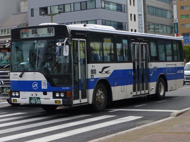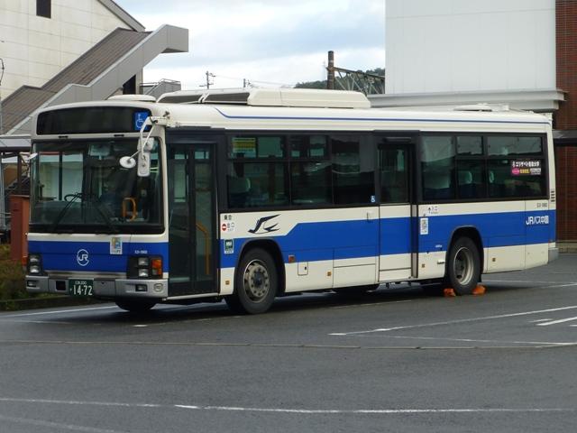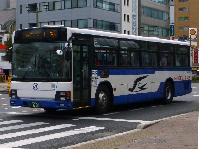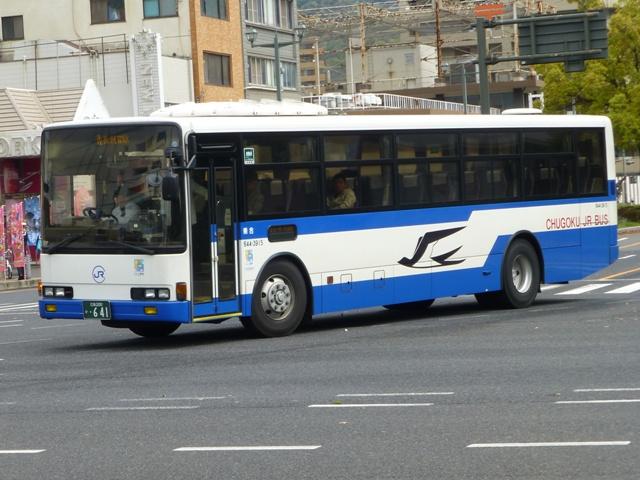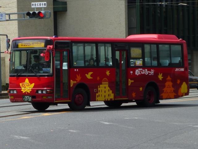 何度も書いていますが、バスラマの感想めいたものを書くため4月に広島へ出かけました。メインは広島電鉄のバスでしたが、もちろん他事業者の画像も記録することが出来ました。ただ、ついでに記録できただけですから、なんとも中途半端な画像だけですがHDDの肥やしにするのも勿体無い。ということで、今回は記録出来た中国ジェイアールバスのバス画像を並べていきます。 なお、型式・年式は「中国ジェイアールバス 所有車両一覧表」『バスマガジン65号』(2014),講談社ビーシー/講談社 を参照しました。 <ひろしまめいぷるーぷ> 社番:334-6952.KC-MK619J(96年車)。 「ひろしま観光ループバス めいぷるーぷ」は広島市中心市街地の観光スポットをめぐる循環バス。当初は2013年4月から半年間の期間限定として運行を開始し、そのまま通年運行となりました。現在は広島駅新幹線口を起点にオレンジルート・グリーンルートという若干経由地が異なる2ルートを、赤色の目立つラッピングを纏った中型車で運行しています。まずは三菱ふそうMKのツーステップ車。 社番:331-4953. 2014年にルートを改正した際、いすゞLRワンステップ車の新車を配置。中国ジェイアールバスがこの路線にかける意気込みを感じます。 <一般乗合車> 社番:534-5952.U-MP618M改(95年車)。 続いて一般乗合車両。古参格となるU規制車の三菱ふそうMPで、中扉4枚折戸仕様の車両。 社番:534-5966.U-MP618M(95年車)。 同じくU規制車のMPですが、こちらは中扉折戸仕様。 中扉折戸は当時の中国ジェイアールバスで標準的な仕様です。 社番:531-1960.LKG-LV234N2(11年車)。 中国ジェイアールバスは不採算地区の一般路線から撤退・縮小をすすめた関係で、90年代後半からしばらく新車導入がほとんど無く移籍車導入で代替を行っていました。不採算地区からの撤退にある程度メドがたった2000年代半ば以降から新車導入を再開し、いすゞLVワンステップ車は2008年以降まとまった台数導入。今では、中国ジェイアールバスの一般乗合車の主力的存在となっています。 <準高速車> 社番:641-4903.KL-LV280Q1(04年車)。 中国ジェイアールバスでは広島と呉を結ぶクレアラインなど比較的短距離の高速路線を準高速とよんでいます。この準高速用の専用車として、2003年から路線シャーシのトップドア仕様を導入しています。まずはいすゞエルガのQ尺トップドア車。 社番:644-3915.KL-MP35JP(03年車)。 こちらは三菱ふそうエアロスターのトップドア車。準高速車にはこのほか、西工E型ボディのUAも在籍しています。 PR