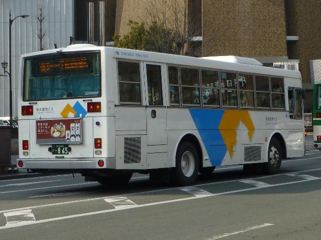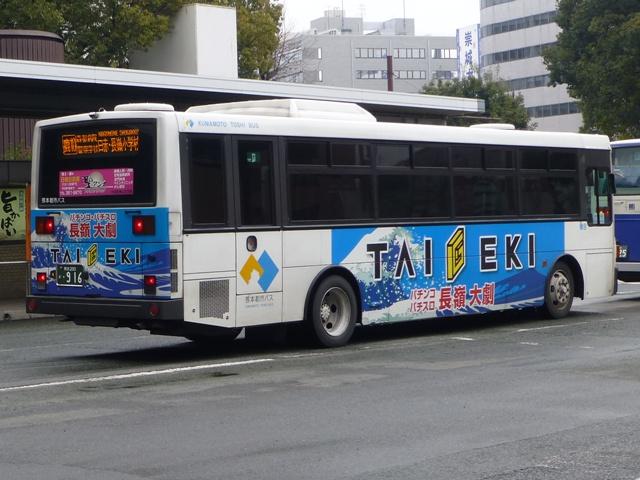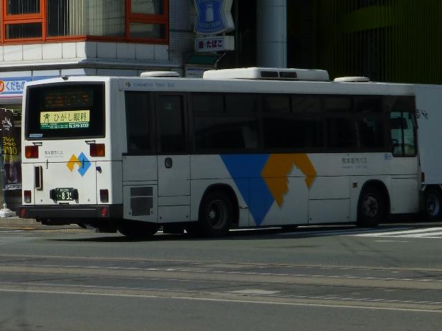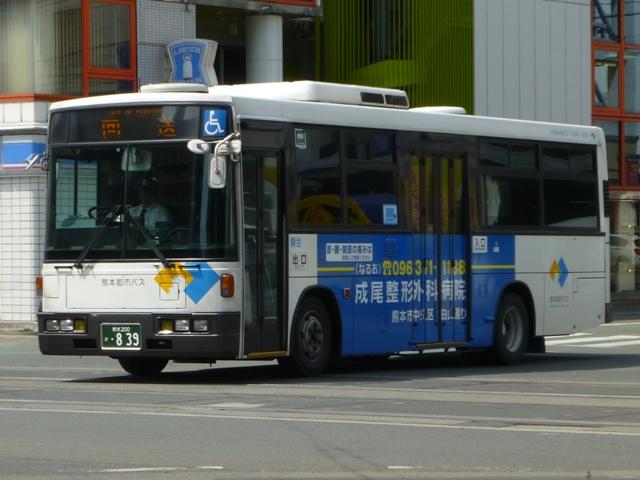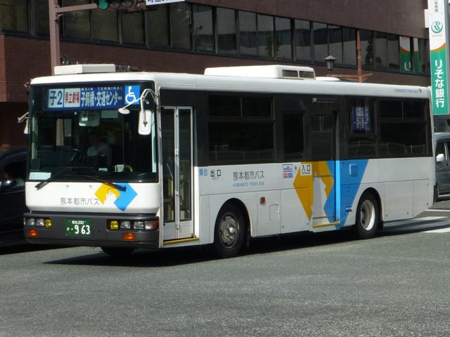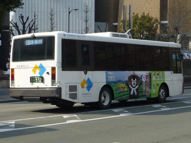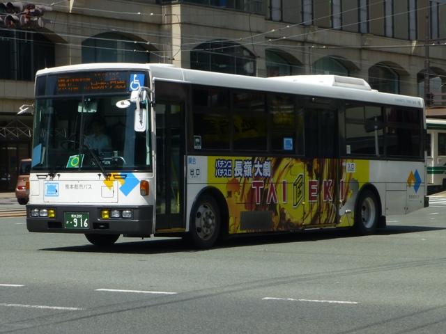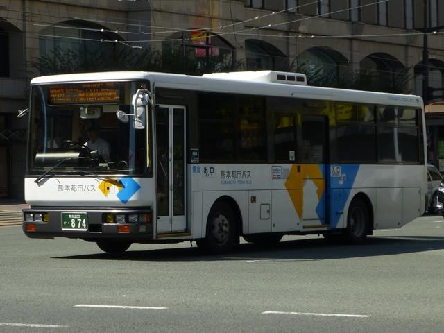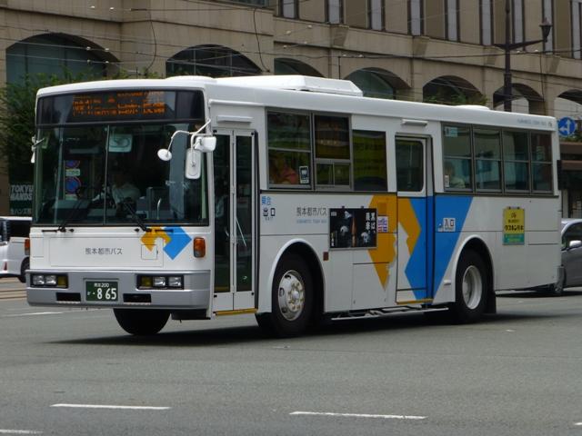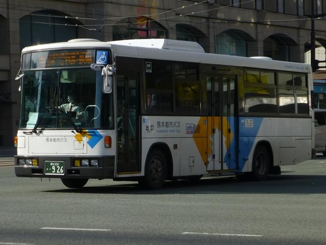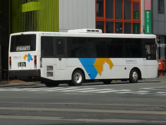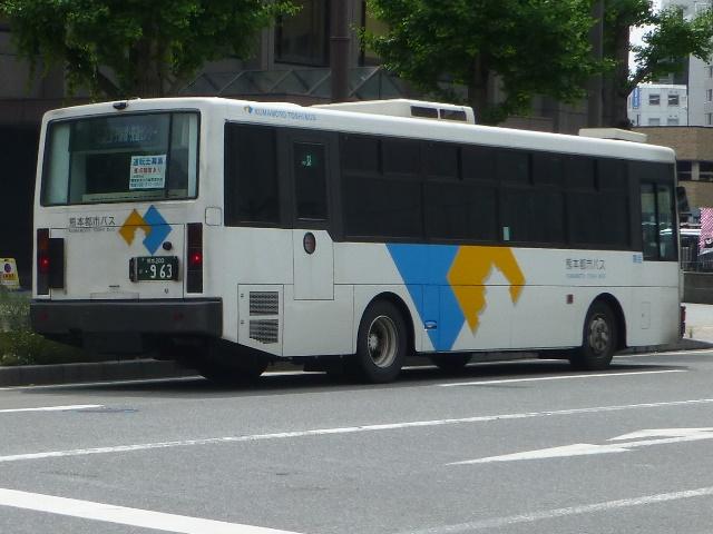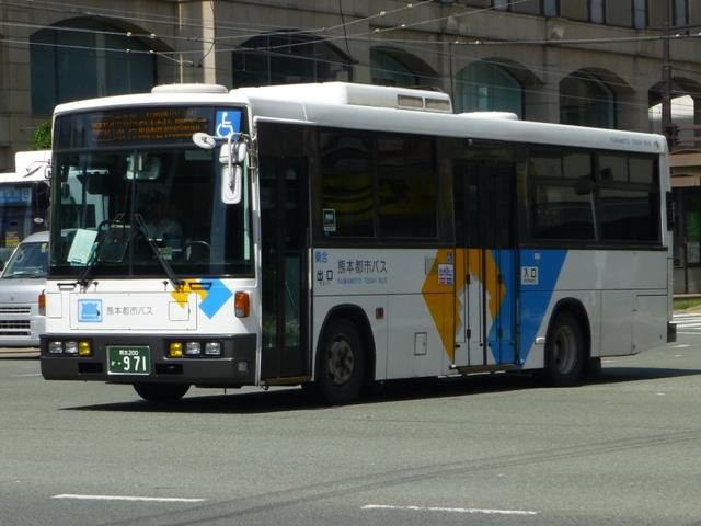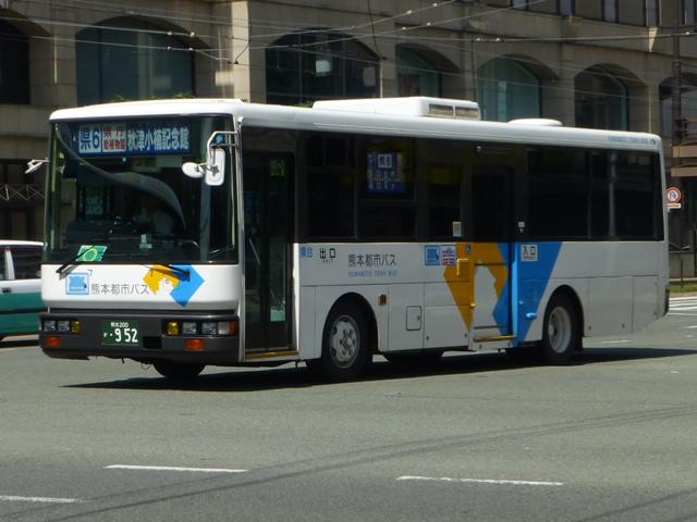 「熊本で見たバス2014-15」と題したバス画像のよせ集めシリーズ。2014年に記録した画像をメインに、多少2015年の画像も混ぜ込んでお送りしております。 今回の熊本都市バス編その6では、記録出来た熊本200かナンバー756から990までの都市バス導入車および2014年度までに市営バスから都市バスへ転籍した車両の画像を並べていきます。 なお、型式・年式は 「熊本市交通局・熊本都市バス在籍車両一覧表」『バスマガジン65号』,(2014),講談社ビーシー/講談社 を参照しました。 熊本200か756.KK-HR1JKEE(03年車)。 在籍車両の大半が熊本市営バスからの転籍車という熊本都市バスですが、古参車代替のため09年頃から独自に移籍車導入を開始しました。最初に登場したのが羽田空港近辺の駐車場送迎自家用バスで使用していたKK規制車の日野HR9mサイズ。移籍事例がまだ少ない年式の新しい車両を導入し、熊本都市バスの本気度を感じました。 熊本200か839.KC-LR333J改(98年車)。 続いて導入したのが、富士ボディのいすゞLR。中扉4枚折戸仕様のワンステップスロープ付き車で、京成バスグループからの移籍車です。 熊本200か865.KC-UA460HSN改(97年車)。 熊本市営バスが11年に京浜急行バスグループから日野ワンステップ移籍車を複数台導入した際、1台だけ導入した江ノ電バスからのUAツーステップ移籍車です。短尺車がネックとなったのか熊本市営バスでの在籍期間は短く、14年4月の路線移譲時に熊本都市バスへ転籍しました。 熊本200か874.KK-RM252GAN(00年車)。 西工スペースランナー顔のRMノンステップバスは前扉後に小型の側面行先表示を設置していたと思しき窓部の特徴から、元は富山県福野町営バスとして導入した車両だったとか。県内他社の移籍車状況から比べると、熊本都市バスはかなり厳選した低床車両を探して導入してる感。 熊本200か916.KC-JP250NTN(98年車)。 移籍車を厳選しすぎた?結果、1型式1台のみとバラエティに富むことになった熊本都市バス。複数台導入した初の移籍車となったのが、京王電鉄バスグループからのJPワンステップ車。富士ボディの在籍台数が着実に増えていきます。 熊本200か926.KC-RM211GSN改(99年車) 富士ボディのワンステップ車導入が続き、中扉4枚折戸仕様のRMは横浜市交通局からの移籍車。横浜 市交通局の中型ワンステップ車はトルコンATを採用していますが、熊本市営バスもトルコンAT愛用事業者のため導入に際してのアレルギーは少なかった模様。横浜市交通局からの中型移籍車はこれ以降、散発的に登場します。 熊本200か937.SKG-HX9JLBE(12年車)。 2012年4月に熊本市が政令指定都市となり、新たに設置される区役所への足としてコミュニティバスの「ゆうゆうバス」が誕生。専用車としてロングタイプの日野HXを導入しました。熊本都市バスが運行主体となりましたが、ほとんどの路線の運行は各区エリアを地盤とする県内事業者に委託されました。運行を開始したものの、案の定利用は低迷。経路変更などテコ入れを行いましたが、熊本電鉄が運行を担当する「植木循環ルート」を除き2015年3月いっぱいで運行終了となりました。専用車として導入した大多数の日野HXは早々に仕事を失い、今のところ都市バスでは教習車としてたまに動く程度となっています。画像は「しろめぐりん」の教習車となっていた際に記録しました。 熊本200か952.KC-RM211GAN改(99年車)。 中型クラス初のノンステップ市販車となった西工スペースランナー顔のRMが代替時期を迎え、移籍車市場を賑わせることに。熊本都市バスでは東西2事業者からそれぞれ1台導入。まずは前扉の後に側面行先表示を設置している西東京バスからの移籍車。 熊本200か963.KC-RM211GAN改(98年車)。 側面行先表示を中扉の後に設置しているRMは阪急バスからの移籍車。熊本都市バスのRMノンステップ車は市営バス転籍車、複数事業者からの移籍車が在籍するバラエティに富んだ状況となっています。 熊本200か971.KC-LR333J改(99年車)。 京成バスグループから富士ボディのいすゞLR移籍車をリピート導入。フロントバンパーにコーナリングライトを装備しています。 PR