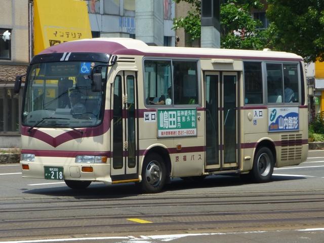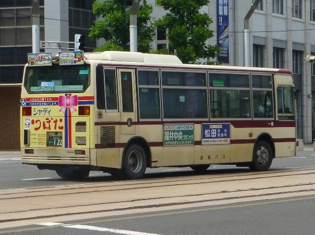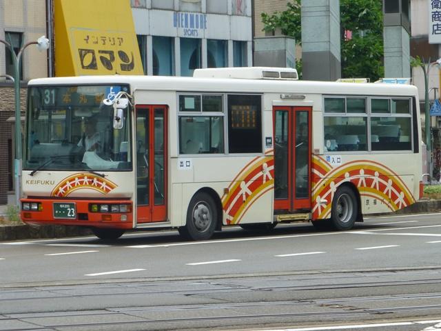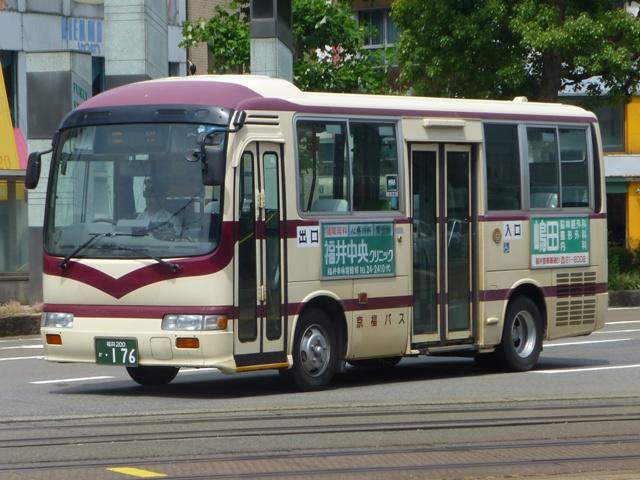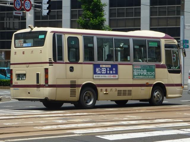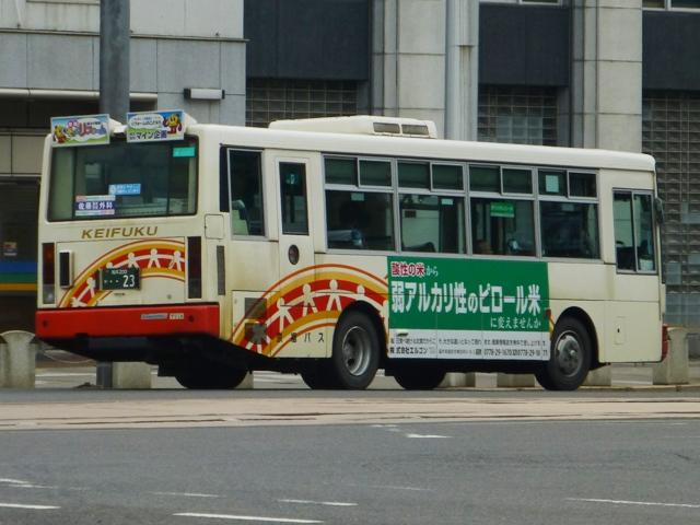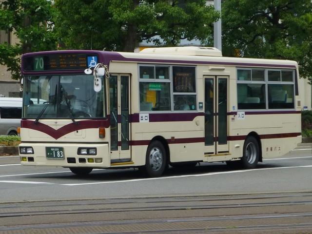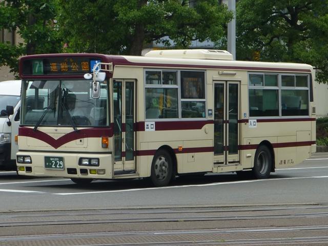 「福井で見たバス2015」と題したバス画像のよせ集めシリーズ。 今回の京福バス編その2では、記録出来た福井200か22~229までの一般乗合車両画像(コミュニティバス「すまいる」専用車除く)を並べていきます。 なお、型式・年式は)『BJハンドブックシリーズS88 京都バス・京福バス』(2015),BJエディターズ を参照しました。 福井200か22.KK-MK23HJ(00年車)。2015年4月に記録。 まずは、側面窓が上部開閉の逆T字とよばれる仕様となったKK規制車の三菱ふそうMKツーステップ車。中型ツーステップ車の新車導入は交通バリアフリー法の施行もあり、この年が最後となりました。 福井200か23.KK-RM252GAN(00年車)。2015年5月に記録。 中型ツーステップ車と並行して中型ノンステップ車も導入しましたが、まさかのUD車が京福バスに登場。00年導入車は西工スペースランナー顔のRMで、中扉はグライドスライドドアとなっています。塗装は98年に導入したMPで採用したノンステップバスオリジナルデザインとなっています。 福井200か68.KK-RM252GAN(00年車)。2015年4月に記録。 同じくスペースランナー顔のRMですが、こちらは目立つピンク色の全面ラッピング車で38系統「大和田エコライン」の専用車となっています。この全面ラッピングのスポンサーの「ラブリーパートナー エルパ」は、福井市近郊のショッピングセンター「福井フェアモール」の核テナントのひとつで専門店街を形成しています。最寄のアピタ・エルパ前で乗降し、「エルパカード」の提示など規定を満たせば運賃を割引するサービスを展開しています。 福井200か122.KK-MJ26HF(01年車)。2015年5月に記録。 01年は三菱ふそうMJのノンステップ車を導入。塗装は路線車標準デザインとなりました。 福井200か176.KK-RX4JFEA(02年車)。2015年5月に記録。 中扉にリフトを装備した日野RX。コミュニティバス向けだけでなく、02年から一般路線用にも導入を開始しました。さすがにカラー系統幕は無く、LED行先表示機のみとなっています。 福井200か183.KK-RM252GAN(02年車)。2015年5月に記録。 02年導入の中型ノンステップ車は再びUDのRMとなりました。スペースランナー顔ではなく、フロントガラス2枚のB-Ⅰ型96MCボディとなりますが、中扉グライドスライドスライド仕様は変わらず。 福井200か218.KK-RX4JFEA(03年車)。2015年5月に記録。 03年導入の日野RX。一般乗合車の新車導入は中型ノンステップ車と日野RXという状況がしばらく続きます。 福井200か229.KK-RM252GAN(03年車)。2015年5月に記録。 03年導入の中型ノンステップ車は前年と同じくRM。見たところ仕様などは同じ模様。 PR