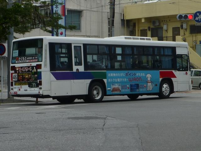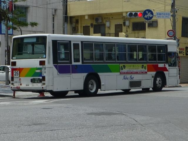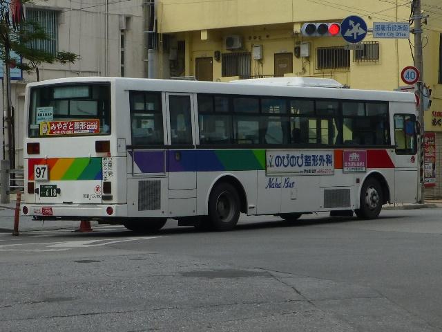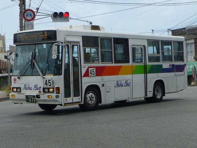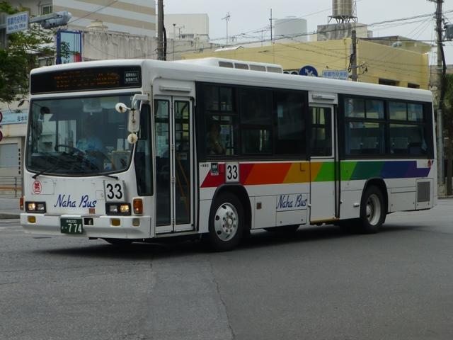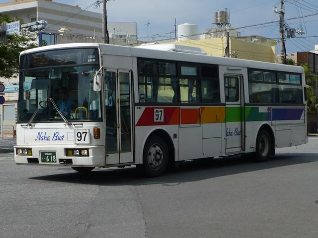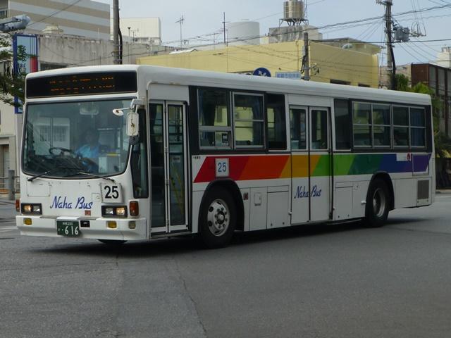 2015年5月に沖縄県那覇市内へ出かけた際に記録したバス画像のよせ集め「那覇市内で見たバス2015シリーズ。 今回の那覇バス市外線編その2では、沖縄200か614から774までの記録出来た車両画像を並べていきます。この時期は京浜急行バスグループから移籍車を大量に導入し、第一交通傘下となった琉球バス交通と那覇バスの古参車代替を推し進めていきました。 なお、型式・年式は「沖縄本島4事業者 在籍車両一覧」『バスラマインターナショナル 150号』 (2015),ぽると出版 を参照しました。 沖縄200か614.KC-HT2MMCA改(95年車)。 まずは前面に日野のウィングマークを取り付けているHTワンステップ移籍車。後面には日野ブルーリボンのエンブレムやテールライト周りをメッキパーツで縁取りするなど、車両のドレスアップに余念がありません。那覇バス市外線では珍しく側面・後面の行先表示をきちんと使用しており、バスドライバーの誇りを感じさせる1台です。 沖縄200か616.KC-LV380Q(95年車)。 こちらは中扉スーパーワイドドアなキュービックボディのいすゞLVツーステップ移籍車。中扉は埋められており、シートが取り付けられています。 沖縄200か618.KC-UA460LSN(95年車)。 UAのワンステップ移籍車。京浜急行バスグループからは廃車をまとめて導入しているようで、那覇交通時代に導入が無かった車種も配置されています。 沖縄200か673.KC-LR333J(96年車)。 京浜急行バスからは中型車も移籍し、市内線・市外線それぞれに配置されています。画像の車両はいすゞLR。 沖縄200か745.KC-LT333J(97年車)。 京浜急行バスでは鎌倉や逗子を中心に配属されていた、いすゞLTツーステップ車も那覇バスに移籍しています。 沖縄200か774.KC-LV280L改(97年車)。 こちらはエアサス仕様となったLVワンステップ車。 PR