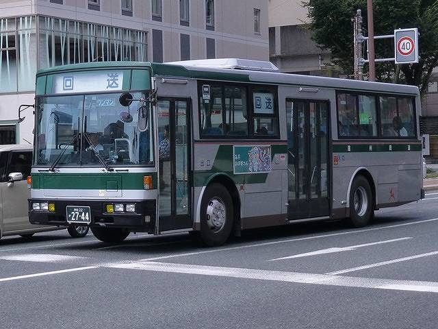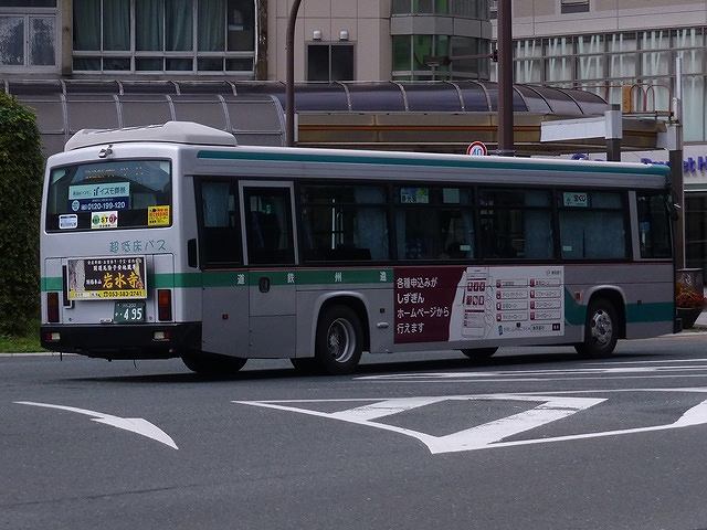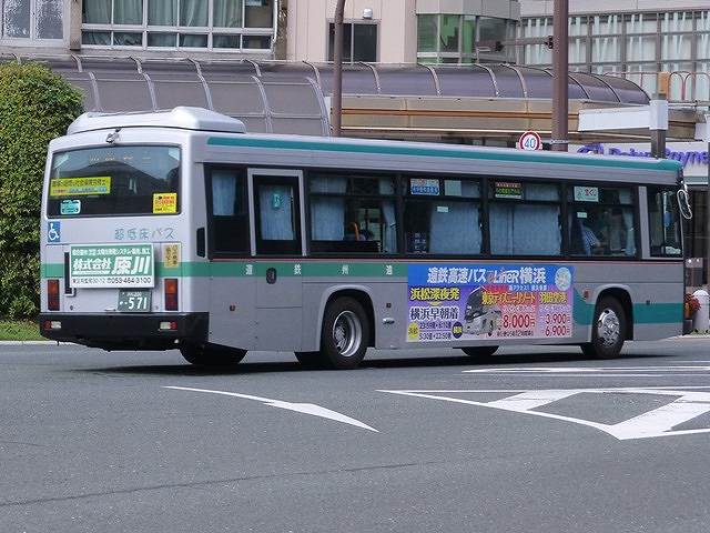 2016年8月に記録したバス画像のよせ集め「浜松駅前で見た遠州鉄道のバス2016」。 今回のその3では、記録出来た日野の一般乗合車の画像を並べていきます。内容はやはり2015年シリーズとほぼ同じですのであしからず。 なお型式・年式は、なお型式・年式は、「遠州鉄道 在籍車両一覧」『バスラマインターナショナル 160号』(2017),ぽると出版 を参照し追記しました(2017年3月3日)。 浜松22か2603.KC-HT2MMCA(95年車)。 まずは古参のツーステップ車から。遠州鉄道では日野の大型ツーステップ乗合車を富士ボディで導入し、見たところ現在もそれなりの台数が在籍している模様。外観的な仕様は他メーカー車と同様、中扉4枚折戸+側面全引違窓+3連テールライトとなっています。 浜松22か2673.KC-HT2MMCA(96年車)。 96年導入の富士ボディな日野HT。ラッピング車も在籍しています。 浜松22か2744.KC-HT2MMCA(97年車)。 97年導入車からフロントバンパー端部にコーナリングライトを装備。 日野車が富士ボディ架装を中止したことにより、以後純正ボディでの導入となります。 浜松200か156.KL-HR1JNEE(01年車)。 オムニバスタウンに浜松市が指定されたことを受け、遠州鉄道の一般乗合車はノンステップ車を標準車として導入を進めました。日野のノンステップ車は三菱ふそうMPノンステップ車に続き、98年からKC規制車のHUを導入しました。当時の日野の大型ノンステップ車はフルフラットAT車のみでしたが、経年劣化などAT関連の不具合が出始めたあたりから代替を開始。KL規制車でモデルチェンジしたブルーリボンシティのATノンステップ車も導入しましたが、こちらも姿を消した模様。 大型車に代わって日野車の導入の中心モデルとなったのが、中型幅10.5mサイズのHR。中扉はグライドスライド、側面の行先表示は中扉直前の窓に設置し、これまで導入したノンステップ車と出来るだけ仕様をそろえているところがポイント。また、コーナリングライトを装備するため前面ウィンカーがやや高い位置となるオプションを採用し、遠州鉄道らしい造り込んだ車両となっています。 浜松200か225.KL-HR1JNEE(02年車)。 02年導入のHR。画像の車両は年式的に正面の「オムニバス」表示が行灯のはずですが、ステッカー表示となっています。 浜松200か314.KL-HR1JNEE(03年車)。 こちらは03年導入のHR。「オムニバス」表示は行灯となっています。 浜松200か375.KL-HR1JNEE(04年車)。 このあたりの導入車から正面の「オムニバス」表示が行灯からステッカーに変更されました。 浜松200か495.PK-HR7JPAE(06年車)。 PK規制車となり中扉が引戸仕様に変更。あわせて側面行先表示は戸袋窓の前の設置に変更となりました。 浜松200か570.PK-HR7JPAE(07年車)。 浜松200か571.PK-HR7JPAE(07年車)。 このあたりの導入車はコーナリングライトを装備していないため、ウィンカーが標準的な位置に変わっています。上下の画像で車両が異なり失礼します。 浜松200か622.BDG-HR7JPBE(08年車)。 ウィンカーを標準的な位置にしたはずが、やはりコーナリングライトは必要だったようで元に戻りました。 浜松200か747.LKG-KV234N3(12年車)。 日野車はHRの導入が続きましたが、1つ目ヘッドライトのPKG規制車となったあたりから大型ノンステップ車の導入を再開します。画像は10穴ホイールとなったLKG規制車のKVノンステップ車。側面行先表示は戸袋窓設置に変わりました。正面帯塗装はHRと異なり、いすゞLVと同じく扉側の一部に帯が無いデザインとなっています。 浜松200か783.QPG-KV234N3(12年車)。 KVノンステップ車の導入が続きます。 浜松200か843.QPG-KV234Q3(14年車)。 ノンステップ車だけでなく、長尺ワンステップ車も並行して導入するようになった遠州鉄道。近年はいすゞ車をノンステップ、日野車・三菱ふそう車をワンステップで導入しています。 浜松200か881.QPG-KV234Q3(15年車)。 このあたりの導入車から側面の遮光ガラスを中止。 浜松200か933.QPG-KV234Q3(15年車)。 8月時点で、日野車最新グループだったうちの1台。 浜松230あ5078.BDG-HX6JHAE(07年車)。 真っ赤な塗装で1ドア仕様の日野ポンチョは浜松市循環まちバス「く・る・る」専用車。循環まちバス「く・る・る」は浜松駅を起点に駅周辺の市街地を循環し、東ループ・西ループ・南ループの3路線を運行しています。画像の車両は前・後面に浜松市マスコットキャラクターの「出世大名 家康くん」、側面には浜松にゆかりのある来年の大河ドラマの主人公「井伊直虎」をPRしたラッピングとなっています。 PR
