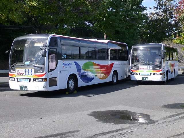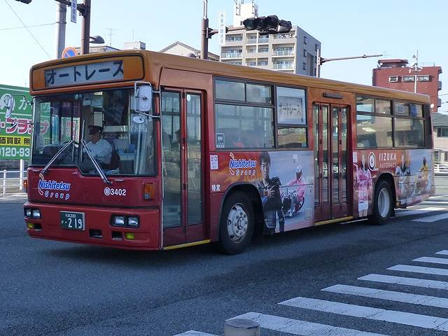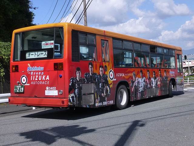 福岡県飯塚市の飯塚オートレース場では飯塚バスセンターから新飯塚駅を経由する無料シャトルバスを本場開催日及び場外発売日に運行しています。今回は拙ブログではたまに更新する公営競技場への無料送迎バス車両の画像よせ集めシリーズ、飯塚オートレース場の無料シャトルバスの車両画像を並べていきます。 社番:5826.KL-U452MAN(03年車)※1。 飯塚バスセンターからオートレース場への無料シャトルバスは西鉄バス筑豊により、通常3台体制で運行しています。運用のメインとなるのが飯塚オートレース場の全面ラッピング車となった2台。まずはUAワンステップ車。ラッピングは浦田選手をはじめ、飯塚オートレース場所属の有力選手の写真を中心としたデザインとなっています。なお、この車両はボディ表記から特定車となっており、運賃箱は取り外しています。 社番:3402.KC-MP317M(99年車)※1。 全面ラッピング車のもう1台は三菱ふそうMPのツーステップ車で、方向幕を活用中。こちらも特定車となっています。先ほどの車両とラッピングの地色は異なりますが、選手の写真など基本デザインは同じものとなっています。 社番:9370.KC-RP250FBN(99年車)※2。 この日運用に入っていた3台目は中型貸切車のRP。定員や仕様など、全面ラッピング車2台とずいぶん異なる車両が運用に入っているものです。 飯塚オートレース場で本場開催日は、飯塚バスセンターからの無料シャトルバスのほか、伊田や黒崎などから直行便も運行しています。 社番:401.U-MS826P(95年車)※2。 直行便はレース開始前と終了後のみ運行。運用車両はレースが終わるまで駐車場で待機することになるようで、直行便は貸切車両で運行していることが分かりました。画像はこの日駐車場で待機していた大型貸切車と中型貸切車。型式は左に停まっていた大型車のほうです。 社番:9380.KC-RP250FBN(99年車)※2。 中型貸切車のほうをズームアップ。前面にマグネットを貼って飯塚オート直行便をアピール。ちなみに描かれている飯塚オートのロゴマークは旧タイプのものです。 なお、型式・年式は下記を参照しました。 ※1)『BJハンドブックシリーズS82 西鉄バス(一般路線バス編)』(2013), BJエディターズ ※2)『BJハンドブックシリーズS81 西鉄バス(高速貸切バス編)』(2013), BJエディターズ PR