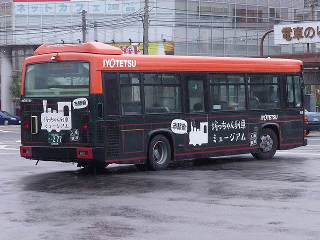 2017年7月に記録した伊予鉄道のバス画像よせ集めシリーズ。今回のその2では、これまで同様独特な書体の「愛媛」200かナンバーで記録出来た一般乗合車画像を並べていきます。 なお、型式・年式は「伊予鉄道グループ 在籍車両一覧」『バスラマインターナショナル87号』(2004),ぽると出版を参照しました。 愛媛200か129.KK-HR1JKEE(00年車)。 99年12月に販売を開始したHRを00年に導入した伊予鉄道。新型車を早々に導入するのはさすが傘下にディーラーを擁しているだけはあります。内装含めオーソドックスな仕様となっていますが、初期導入のHRは中扉上部にスピーカーを装備しています。 郊外電車・市内電車・バスの塗装デザインは、2015年からスタートした「IYOTETSUチャレンジプロジェクト」の一環でオレンジ色1色にすることとなり、現在塗り替えやラッピング対応で1色化が進められています。 ラッピング広告車は広告部以外をオレンジ色の新デザインラッピングで対応しています。このためパネルの縁などに旧塗装のクリーム色が見え隠れしています。 愛媛200か156.KK-HR1JKEE(01年車)。 伊予鉄道は01年からサービスアップを目的とした「サービス向上宣言」をスタート。この一環でノンステップバスのさらなる導入が進められることになり、コンスタントにHRの導入が行われました。画像の車両はグループの伊予鉄不動産が経営するイヨテツスポーツセンターの全面ラッピング広告車となっています。ちなみにイヨテツスポーツセンターは夏はプール・冬はアイススケートリンクを営業し、ボウリング場も隣接するスポーツ娯楽施設です。 愛媛200か158.KK-HR1JKEE(01年車)。 こちらは2010年に記録したときと変わらず「ALSOK」ラッピング広告車となっているHR。見比べると行先表示が方向幕からLED、外装のオレンジ1色化など7年間の変化を実感します。また、8番線と10番線に見られた年代物風な系統板の掲示は、この7年の間にとりやめたようです。 愛媛200か247.KK-HR1JEEE(02年車)。 都心部循環路線や電車連絡ループバスなどが新設されたのも「サービス向上宣言」の取り組みによるもの。これらの路線を中心に活躍するのが7mサイズのHR。ちなみに02年導入のHRは7mサイズのみとなっています。画像の車両は旧標準塗装デザインですが、ループバスの塗装デザインの車両も在籍しています。 愛媛200か277.KK-HR1JKEE(03年車)。 03年導入のHRは9mと7mサイズ。画像を記録できたのは9mサイズで、「坊っちゃん列車ミュージアム」ラッピングの車両。「坊っちゃん列車ミュージアム」は松山市駅前の伊予鉄道本社1階につくられた展示施設で、公式ホームページによるとラッピングバスは3台在籍しているとのこと。 PR