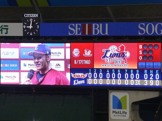 プロ野球を観戦したらブログに書いていくシリーズ。 湿度は高いながら気温は平年よりも低いので、しのぎやすいのか確認しに、今日はメットライフドームで観戦です。 埼玉西武 3x- 0 東北楽天 息詰まる投手戦、延長戦突入と思われた9回裏2アウトからまさかのサヨナラ勝利。栗山に対して浅すぎる外野の前進守備に勝利は確信しましたが、まさかホームランになるとは。 小生がサヨナラホームランを生観戦したのは、1999年あのボーリックナイト以来ではないかと・・・。 今日で炎獅子ユニフォームを着用した「ライオンズフェスティバル2017」はひとまず終了。炎獅子ユニフォームはゲンのよさから9月に再登場があるといわれていますので、楽しみにしたいところ。今頃中国で炎獅子商品の再生産をしていることでしょう。 去年のエメラルドユニフォームは不人気商品在庫一掃のため無駄に延長したことは忘れられません。 PR