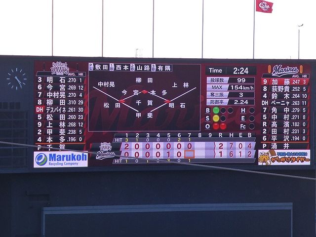 千葉まで出かけて今年の千葉ロッテマリーンズの主催試合観戦するのは、正直気が進まないまま9月に入ってしまいました。ロッテが勝てる見込みが非常に低いソフトバンク戦ですが、ファンクラブ特典の自由席引換券を消化するため、今年2度目のZOZOマリンスタジアムで観戦です。 千葉ロッテ 1- 2 福岡ソフトバンク 初回平沢のエラーからの連打で2点をあげたソフトバンクが逃げ切り勝ち。ロッテは7回2死満塁、一打逆転のチャンスを作るも加藤が三振に倒れてジ・エンド。ロッテ先発涌井は立ち上がりの2失点で負け投手では・・・。 今年はもうZOZOマリンスタジアムで観戦することはないでしょうが、千葉ロッテファンとしてはオープン戦がピークだったという寂しいシーズンとなりました。 PR