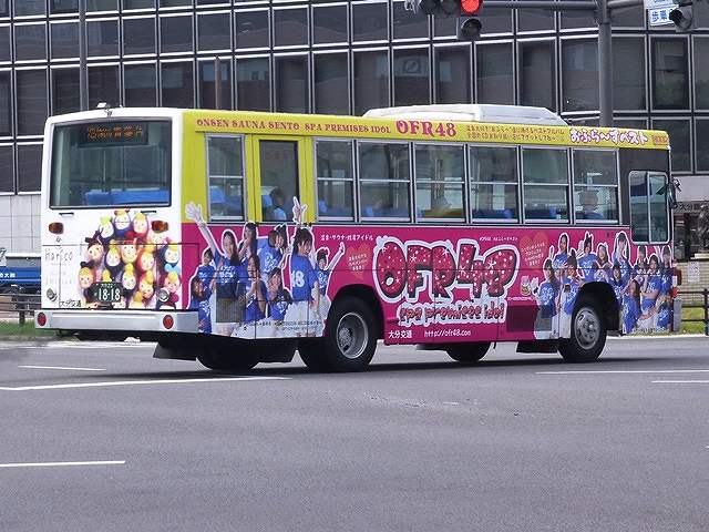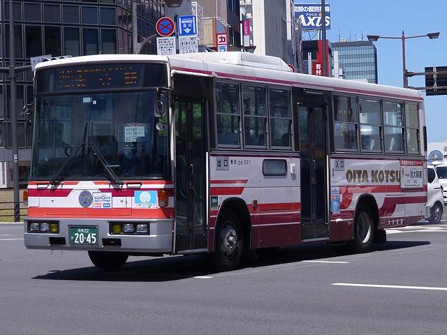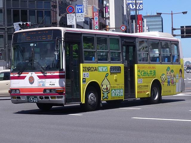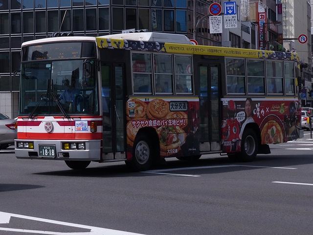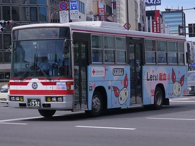 9月に大分駅前で見たバス画像のよせ集めシリーズ。今回は大分交通編その1と題し、記録出来た大分22かナンバーの一般乗合車両(転用車含む)画像を並べていきます。 なお、型式・年式は「大分交通グループ 在籍車両一覧」『バスラマインターナショナル94号』 (2006),ぽると出版 を参照しました。 また、大分交通の一部車両には「O I 624」のような所属営業所・メーカーをあらわす社番表記がありますが、参考資料としたバスラマによれば既に現場では使用していないとの事。拙ブログでは、登録番号のみの記載とさせていただきます。 大分22か1812.U-MS726S改(92年車)。 今回記録出来た古参ナンバーの車両だったのが西工C-Ⅰ旧ボディのMS。型式を参照したバスラマ掲載時は大交北部バス所属の貸切車でしたが、現在は路線車に転用。転用にあたり行先表示を後付で取り付けています。2013年編で並べた同型車は行灯部に幕式行先表示が収まっていますが、こちらはいかにも後付と分かる豚鼻行先表示となっています。普段はAPU路線で使用しているようですが、この日は大分空港と別府を結ぶリムジンバス「エアライナー」の運用に入っていました。 大分22か1818.U-RM210GSN(92年車)。 ここから大分駅前で記録した一般乗合車。大分交通は4メーカーを導入していますが、1~2台 しか在籍していない車種も少なくない状況。まずは前中折戸仕様の富士8EボディなRM。ラッピング広告車ですが、左・右側面・後面すべて異なるスポンサーとなっています。 行先表示はLED改造しており、側面は窓部にあわせた大きさのLED表示機を新たに設置しています。従来の側面窓下に設置した行先表示は「大分交通」幕に固定しています。 大分22か1960.U-MK218J(95年車)。 三菱ふそう車は高速車の導入が多く、一般乗合車は少数という状況。モデルチェンジ後のボディを架装したMK。 大分22か1962.U-RM210GSN(95年車)。 記録できた大分22かナンバーはUDのRMばかり。「ジェットスター」のラッピング車となっているRM。 大分22か1992.U-RM210GSN(95年車)。 UDのRMをもう1台。こちらは日本赤十字社による献血PRのラッピング車。 大分22か2045.KC-RM211GAN(96年車)。 テールライト形状が変わったKC規制車のRM。大分交通はKC規制車の一般乗合車をエアサスで導入しました(一部車種に例外有)が、KC規制車の一般乗合車導入台数がかなり少ないためレアな存在。 PR