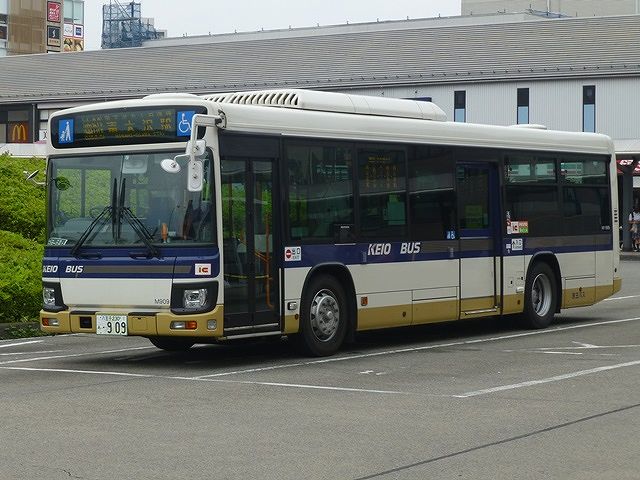 京王バスでは「ノンステップバス」などのボディ表記を2018年後半から段階的にとりやめ、簡素化を進めています。画像の19年導入車は、従来後部や側面にあった「ノンステップバス」の表記が無くなりました。 社番:M11909.2021年6月東京都八王子市南大沢駅前で記録。