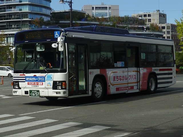 熊本200か1720.2021年10月熊本市桜町バスターミナル近辺で記録。 今回は九州産交バスに在籍するPJ規制車の日野KVノンステップ車を右斜め後から。 ボディには今年の4月から運行を開始した「まちなかループバス」のラッピングを施しています。側面窓は遮光フィルムを貼り、近年の九州産交バスらしい外観となっています。 熊本200か1720.2021年10月熊本市桜町バスターミナル近辺で記録。 左斜め前からの画像。 「まちなかループバス」の運用時は前面に涎掛けを取り付けています。 画像の日野KVは、屋根前方に搭載している角型換気機器からお分かりの通り、東京都交通局からの移籍車となります。車内はシートモケットを張替え、戸袋窓部の横向きシートだった優先席を前向き1人掛けシートに交換するなど、出来るだけ自社発注車に合わせるように改造しています。何か都営バス時代の名残はと探すと、画像の車両は中扉の窓ガラスに一部営業所で見られた注意標記が残っています。 さて、「まちなかループバス」は熊本駅と中心市街地の「通町筋」を「早く・安く・分かりやすく」結ぶことを目的に熊本市が企画し、運行を九州産交バスと熊本電気鉄道が担当しています。企画した熊本市交通政策課のHPによると、「まちなかループバス」は「中心市街地の回遊性向上を図り、更なる賑わいの創出や公共交通利用者の増加を目的 」にしているとのこと。現在は試験運行ということから、土曜・日曜・祝日の午前9時半から午後6時半に15分間隔での運行となっています。 熊本200か1657.2021年10月熊本市桜町バスターミナル近辺で記録。 せっかくなので熊本電気鉄道の「まちなかループバス」運用車両の画像も並べておきます。「まちなかループバス」はノンステップバスによる運行となっていることから、両事業者とも導入まもないノンステップ移籍車に「まちなかループバス」のラッピングを施しています。 画像のいすゞLVノンステップ車は、中扉窓ガラスのオレンジ色文字の注意標記や扉側前タイヤハウス上部のシート無し、濃緑色系の床材などの内装より、京成バスグループから移籍したと分かります。 PR ![]() ![]() |