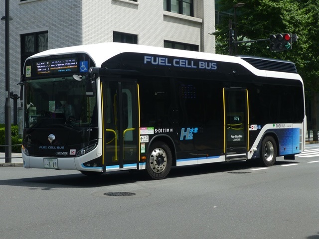 塗装は従来の都営バス車両と全く異なるデザインを採用。後輪部のグラデーションはイチョウの模様を配しています。東京都交通局は2020年の夏季オリンピック・パラリンピック開催に向け、低公害の燃料電池バスをまとまった台数導入することを発表しました。本格採用に向けた実証実験を経て、2016年度に先行市販車を2台導入。翌2017年度から量産モデル「SORA」の導入を開始しました。 「SORA」の側面窓は運転席側の中央部2ケ所が車内側に開きますが、乗客による開閉操作は基本的に出来ない仕組み。見た目で分かりやすい窓の開閉による換気が求められるようになるとは、設計段階で想定していなかったのでしょう。 70:S-D111.2022年6月東京都千代田区「東京駅南口」付近で記録。 左斜め前からの画像。 未来感のあるデザインということなんでしょうが、とにかく黒いところが多い印象です。 トヨタ「SORA」は6年リースを基本契約としていますが、はたして契約を延長出来るのか、契約満了→引退となるのか気になるところです。 PR