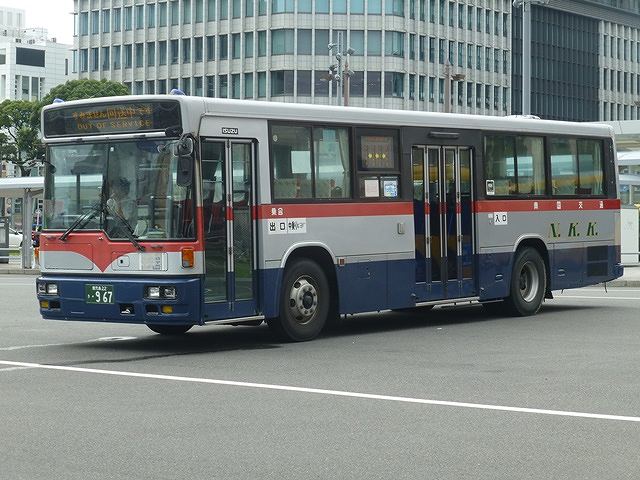 V8エンジンを搭載したKC規制車のLVで、エアサス車です。全引違仕様の側面窓に、車内は枕カバー付きのハイバックシートが並ぶ1990年代南国交通の一般乗合車の標準仕様を今に伝える生え抜き車両です。 鹿児島22き862.2022年7月鹿児島市鹿児島中央駅で記録。 左斜め前からの画像。 中扉は4枚折戸仕様となっています。96年に導入した画像のKC規制車ではフロントバンパーにコーナリングライトを装備しました。 経年車ですから、内外装ともに劣化しているところが見られますが、リクライニングしてもおかしくない立派なシートは近年導入が続く低床移籍車には無い装備ですから、長く活躍してほしいものです。 鹿児島22き967.2022年7月鹿児島市鹿児島中央駅で記録。