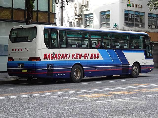 車号:8E52.2023年2月長崎県長崎市「中央橋」交差点で記録。 今回は長崎県営バスこと長崎県交通局が2006年に導入した、PJ規制車のMSを右斜め後から。4列シート・トイレ無し仕様のハイデッカーで、長崎空港路線など県内短距離高速路線が運用のメインとなっています。