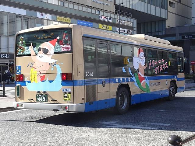 横浜市交通局の「イルミネーションバス」から鶴見営業所の1台、日野KVノンステップ車の右斜め後からを更新するつもりでした。 ただ、今年の12月の横浜は好天続き!冬の鶴見駅東口は逆光と影、なによりもタイミングが合わずでこの1枚しか記録出来ませんでした。まあラッピングデザインは異なりますが、昨年と同じ車両なので・・・。2025年は頑張ります。