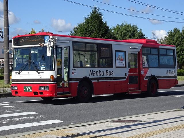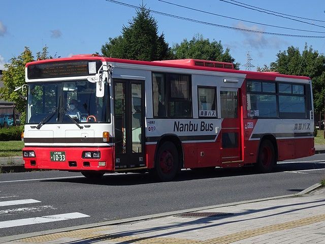 八戸200か964.2025年9月青森県八戸市立市民病院前で記録。 今回は南部バスこと、岩手県北自動車南部支社に在籍する日産ディーゼルJPノンステップ車を右斜め後から。 南部バスは経営不振から2016年11月に民事再生法を適用、バス事業はみちのりHD傘下の岩手県北自動車に譲渡しました。2017年3月より岩手県北自動車 南部支社として再出発し、老朽車の車両代替が急ピッチに行われました。急ピッチで車両代替を進めるのが、みちのりHD式バス会社再生術の定番で、その車両代替として登場したのが京王電鉄バスグループからの移籍車というのもド定番となります。2010年代後半の京王電鉄バスグループは中型幅10.5mサイズのノンステップ車を代替を進めており、みちのりHD傘下の事業者に日野HRや日産ディーゼルJPなどがまとまった台数移籍しました。南部バス時代は縁の無かった日産ディーゼル車が南部支社となってから激増しました。 画像のJPノンステップ車は京王電鉄バスからの移籍車で、外観的には南部バスカラーに塗り替えただけという感じです。 八戸200か964.2025年9月青森県八戸市立市民病院前で記録。