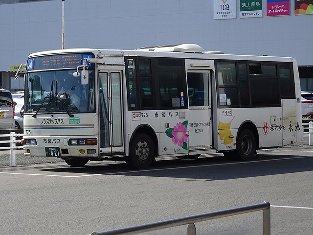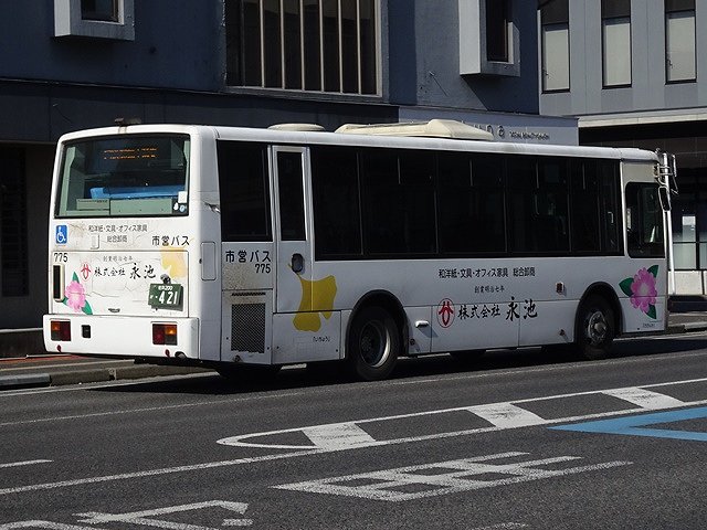 画像の車両はだいぶ長いこと佐賀の老舗文具・紙製品卸商社のラッピング広告車となっており、ラッピング素材の劣化が目に付きます。 車号:775.2025年11月「佐賀駅バスセンター」で記録。 左斜め前からの画像。