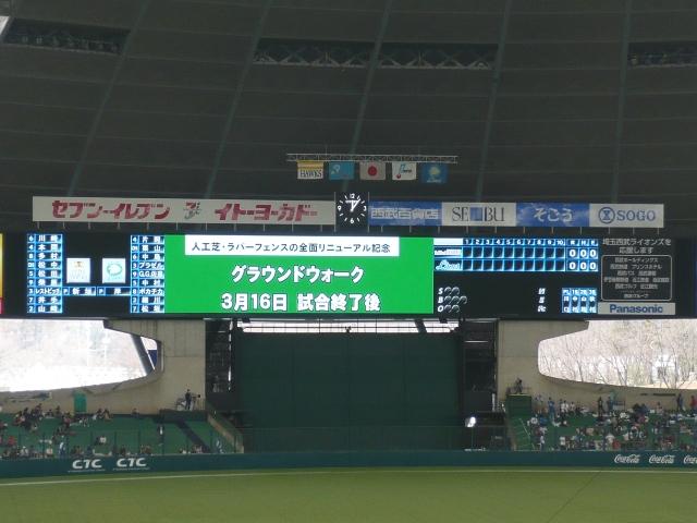 2008年初のプロ野球観戦。今年も野球観戦記を拙ブログで紹介する時期になりまし た。といっても黒木を見に行くわけではなく、猫屋敷で観戦しているですが。 グッドウィルドーム改め西武ドーム。 球場施設を2年がかりでリニューアルするとか。これで松坂マネーを使い果たすそうです。 なんだか妙にファウルゾーンが狭くなっているんですが。これでカブレラもファウルボー ルを追わなくて済みます←違。来年のフィールドシート化への布石でしょうか。 スコアボードも一新。アストロビジョン(仮称)。人工芝も張替え、ファンにもお披露目と いうことで試合終了後グランドウォークを開催。いつもアレなファンサービスが猫クオリ ティですが、これは珍しく良い企画です。 2008年スローガン発表。「野球力」だってさ。 ソフトバンク 1-8 埼玉西武 いきなり試合結果。得点だけ見ると西武打線爆発という感じですが、ソフトバンク先発の 新垣が悪すぎました。西武は無死満塁で暴投による1点のみというロッテ野球も見せつ ける余裕もありました。あとは松坂が良いアピールをしていました。ソフトバンクは早く帰 りたかったのか淡白な攻撃で試合のスピードアップに貢献。相変わらず7番打者助っ人 を獲得するのならズレータをクビにするなよという気も。 最後はグランドウォーク。人工芝を踏みしめてきました。 いよいよ今週3月20日にパ・リーグが開幕します。今年はどうなることやら。 PR