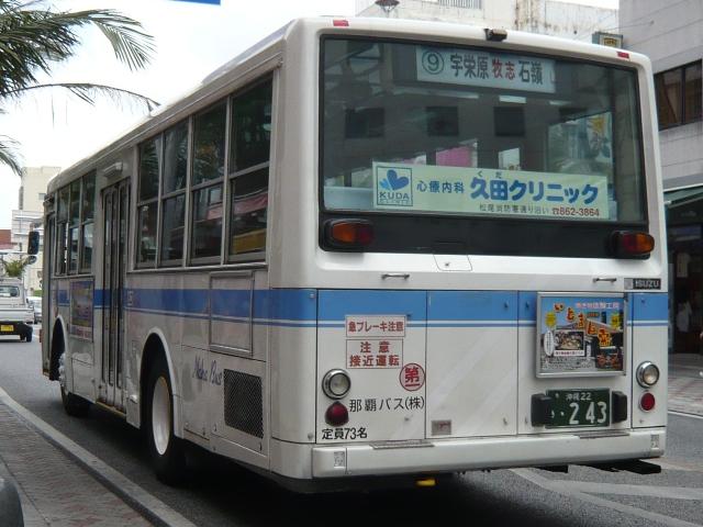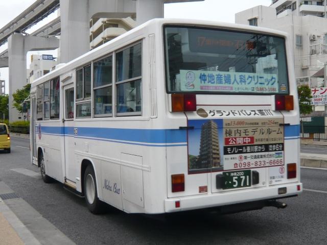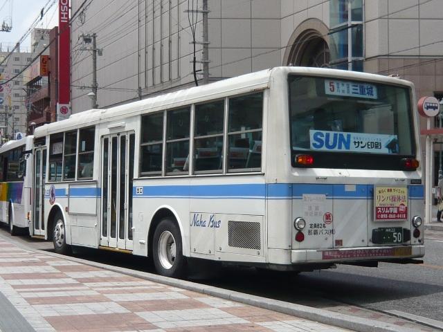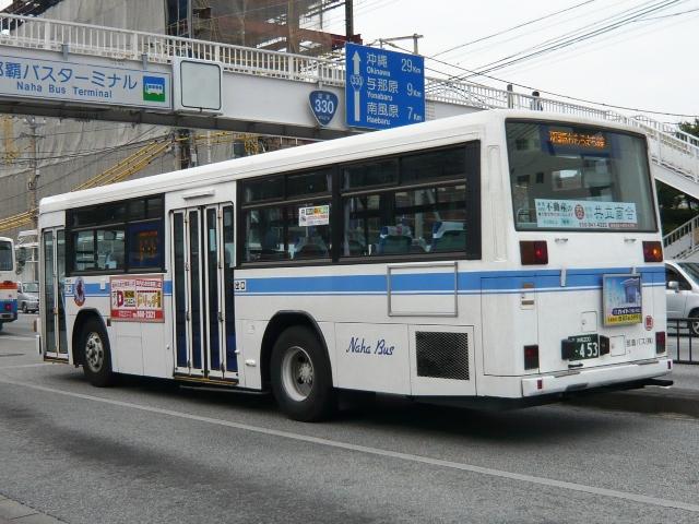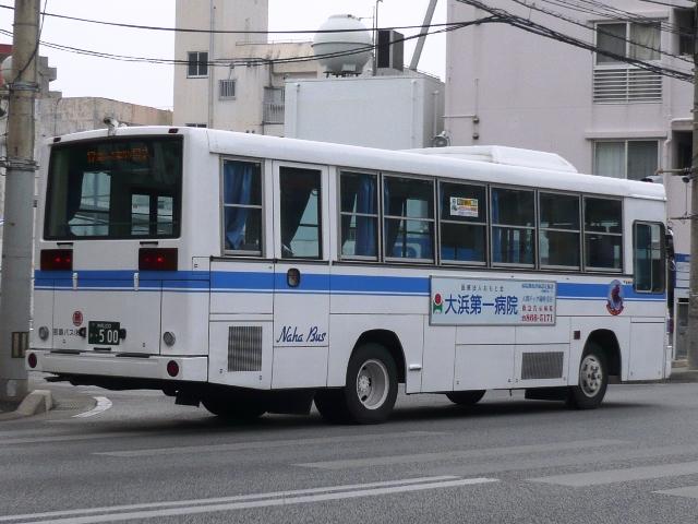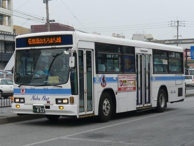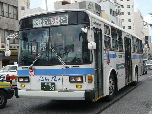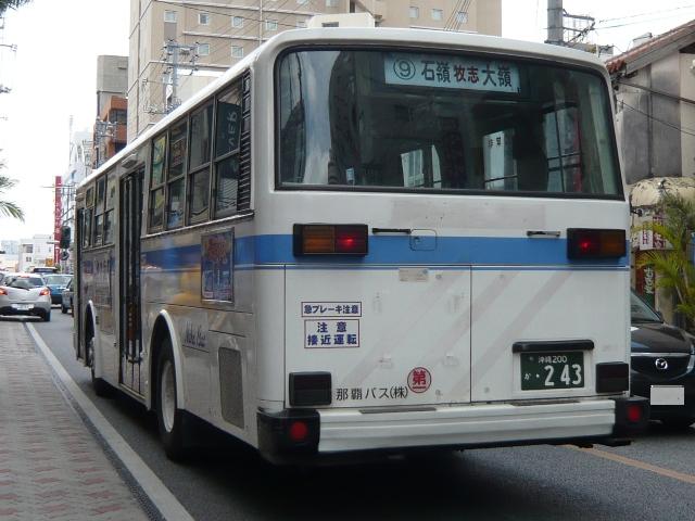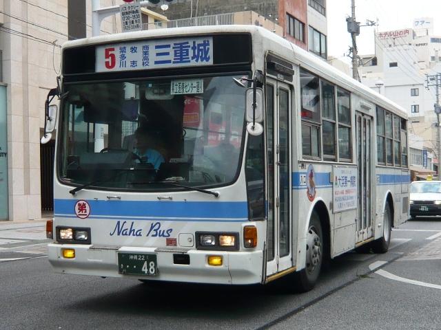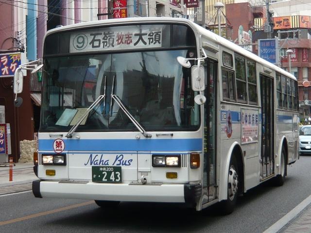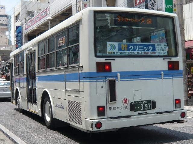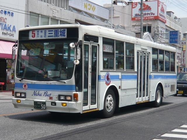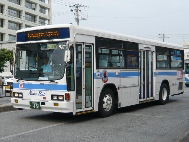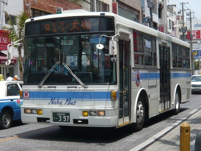 沖縄で見たバスシリーズ。今回は那覇バスの市内線カラーのものを。那覇バスは那覇 市内線の大部分(※沖縄バスが8番:首里城下町線を運行)と郊外線を運行しています。 乗降方法や運賃支払方法が異なる為か、市内線と郊外線とでは車体の塗装デザインが 異なります。市内線はかつて那覇交通時代は銀バスと呼ばれる塗装と、白色にカラフル な斜め上がりの細帯を入れたものでしたが、那覇バス後は白色に水色帯の随分すっきり &さわやかなカラーとなっています。 なお、型式・年式は 「那覇バス車両一覧」『バスラマインターナショナル86号』(2004),ぽると出版を参照。 沖縄22き48.P-LV314L改(88年車)。 見かける市内線は大体こんな感じ。自社発注車はキュービックの中4枚折戸。 沖縄22き50.P-LV314L改(88年車)。 新塗装は簡単に仕上げたのか、那覇交通時代の帯跡が残ります。 那覇市内線の多くは那覇BTを経由しないものが多く、画像の多くは国際通り周辺をうろ ついた際に撮影しました。市内線を撮るならここ!という有名撮影ポイントもあるようです が調査不足で分かりませんでした。 沖縄200か135.P-LV314L改(87年車)。 沖縄200か243.P-LV314L改(87年車)。 那覇交通市内線移籍車といえば元小田急。『僕たちの大好きなバス』によればだいぶ 数を減らしているという5E。一部は那覇空港内のランプバスとして活躍している為、市 内線では見る機会はさらに少なくなっている様子。ただ5E自体は琉球バス交通では まだまだ現役、割と見ることが簡単に出来ます。 沖縄22き243.P-LV314L改(90年車)。 沖縄22きナンバーと沖縄200かナンバーの同番号が存在するという例。 沖縄200か397. 那覇バス発足後の移籍車。屋根上から都営?U-LV324Kと思われる7E。 沖縄200か451. 沖縄200か453. 那覇BTで見られる那覇バス市内線といえばこれ。6番那覇おもろまち線で使用される ハイバックシート+上部引違いガラスのキュービック。元国際興業の8000番台。 沖縄200か500. リヤしかありませんが、前後扉の8E中型バス。慌てて撮るからこういう結果に・・・。 17番石嶺(開南)線で走っているところを壷川付近で撮影。 沖縄200か571.U-LR332J(94年車)※。 どうもタイミングが合わず、那覇バスの中型の画像はリヤのみという結果。 17番は中型の頻度が高いようですが、市内線では本数が少ない方なので確証は持てず。 画像のLRは京浜急行バスからの移籍車。型式・年式は車内のD1454社番跡から。車内 は、京急ナロー車特徴の中扉前立席スペース部に座席が増設されていました。 新ポンチョ&郊外線は次回以降の更新ということで。 ※『BJハンドブックシリーズR55 京浜急行バス』(2005),BJエディターズを参照。 PR