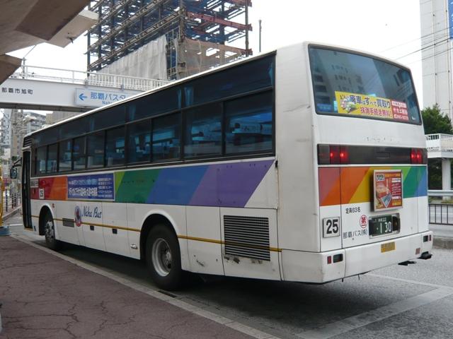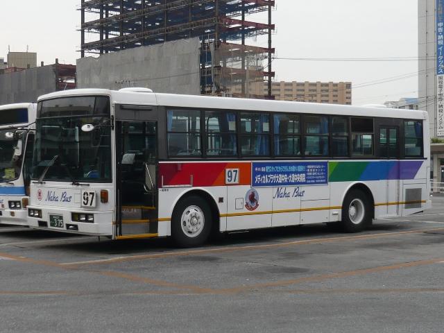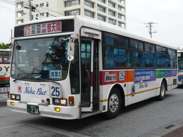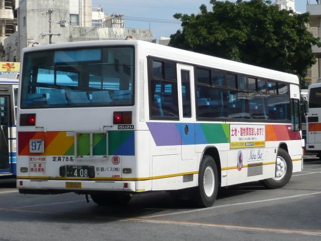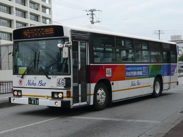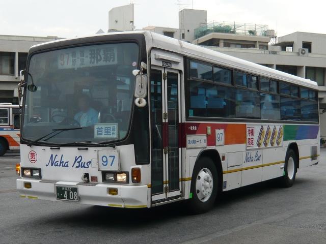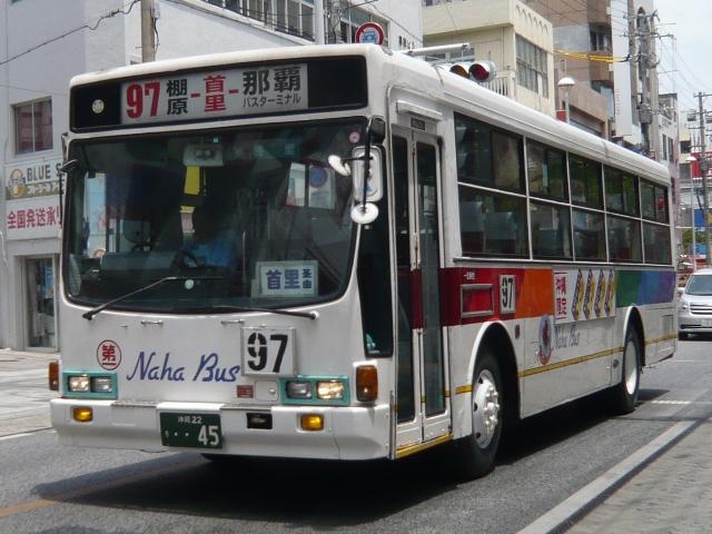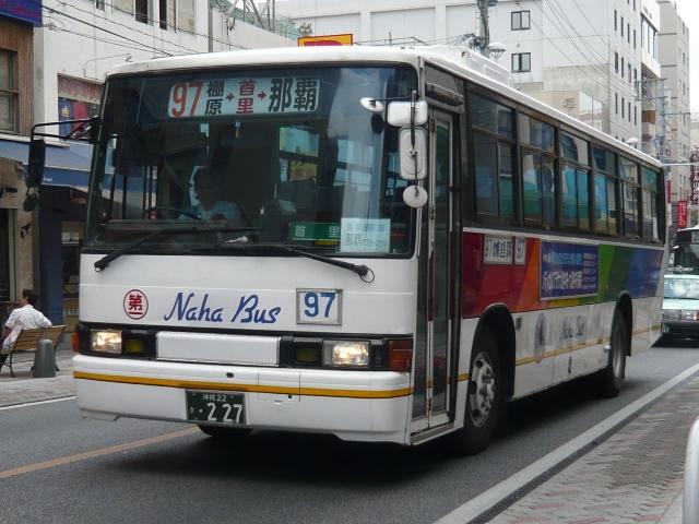 沖縄で見たバス。今回は那覇バスの郊外線画像のよせ集め。デザインが若干異なると はいえ、まさかこのカラーが琉球バス交通でも見られるようになるとは。 なお、型式・年式は 「那覇バス車両一覧」『バスラマインターナショナル86号』(2004),ぽると出版を参照。 沖縄22き45.P-LV314L(88年車)。 那覇交通自社発注の郊外線仕様のキュービック。この車はライトベゼルの色がおかしな ことになっていますが。 沖縄22き130.P-LV719N(89年車)。 リヤのみで失礼、貸切転用のクルーザーも。居住性は良さそうですが、ボディは大分お疲れ の様子。 沖縄22き227.P-HT235BA(90年車)。 沖縄22き233.P-HT235BA(90年車)。 90年にまとまって導入されたブルーリボン顔HT。キュービックにあわせたのか?フロント1 枚ガラスとなっています。 沖縄22き236.P-LV314L改(90年車)。 こちらはキュービック。側面窓が88年導入したものと比べると、いくぶんすっきりした感が。 沖縄22き408.U-LV324L(92年車)。 U規制車はオプションのフロントガラス拡大仕様で登場。那覇か山陽か都営の養護車かと いう感じ。 沖縄200か375. ここから那覇バス後の導入。近年稀に見るスピードで移籍車の導入し、急ピッチで730車 の代替が進みました。まずは前後折戸の富士7E、東武からの移籍車。 沖縄200か417. こちらはセーフティウインドが特徴の元京阪HT。 このほか元京急のふそうなどもちらりと見かけましたが、撮影には至らず。無念。 PR