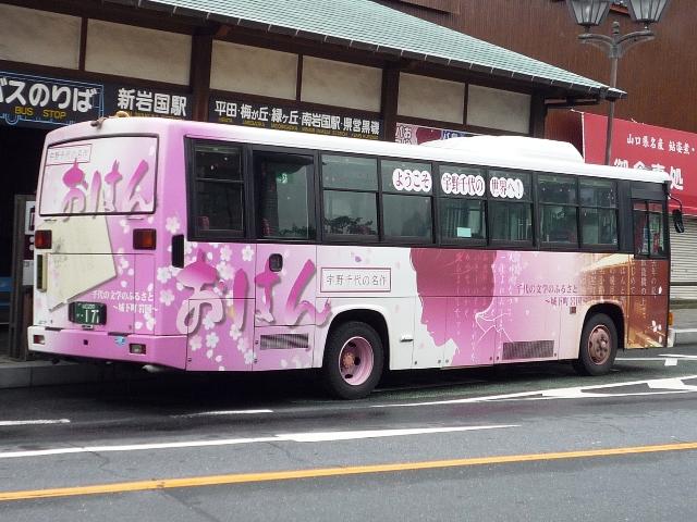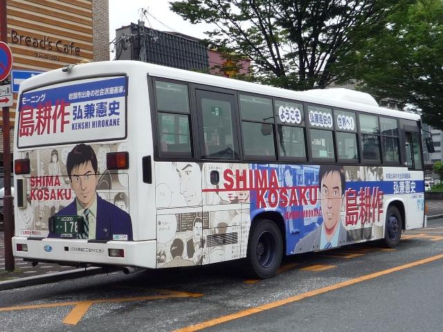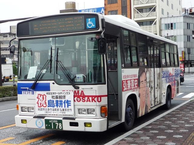 岩国市交通局の画像よせ集めの続きになります。今回はテーマを持ったフルラッピング 山口200か178. 続いて岩国出身の漫画家弘兼憲史の代表作ということで「島耕作バス」。初芝・五洋ホー ルディングス社長就任おめでとうございます。やはりリヤウィンドウを覆うラッピング。 山口22く2871. 近年公営バスでは珍しく、高速バスに参入。広島バスセンターと岩国を結ぶ錦帯ブルーラ イナーを運行しています。専用カラーのブルーリボンの他に、画像の貸切色セレガも。車 内はいかにも貸切転用という感じです。それにしても正面行先表示の取付けに対し、これ しか方法が無かったのかと。 せっかくなのでバス停の画像も。中国地方でよく見かける2本パイプなこのタイプ。 工場地区の一角にある交通局で撮影。 交通局の一角に「交通局食堂」なるものが存在。見たところ職員限定では無いようですが? 岩国では時間が無く、ロクな画像(普段以上にという意味)も撮れず消化不良気味でした。 PR