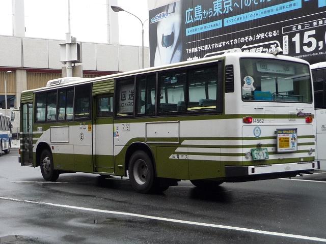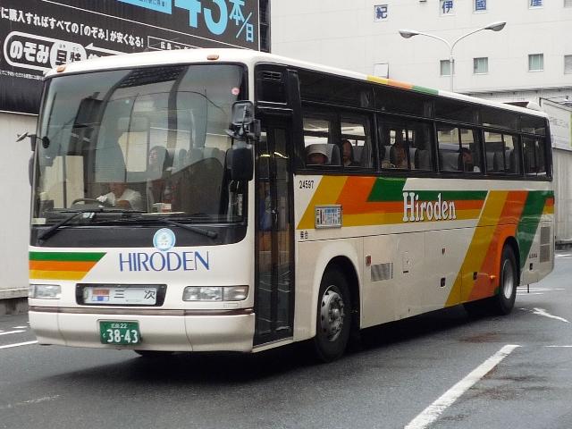 広島で見たバスシリーズ。今回はバスセンターで見た広島電鉄のバス画像よせ集め。 バスセンターということでメインは郊外線と高速バスになります。 なお、社番は画像から判断しましたが、いかんせんアレな画像が多いため読み間違って いる可能性があります。あらかじめご了承願います。コメント等で訂正いただければさらに ありがたく思います。 社番:24516. まだまだ見かけるP規制のブルーリボン。さすがにもう角型スケルトンはいないようですが。 ウイングマークも誇らしげです。 社番:14562. そして正面行先表示周りが変わったU規制車。基本的に郊外線は中引戸がデフォ。 24621. そして角目・逆T字窓のブルーリボン。見た感じ少な目な気が。 24694. 順当にエルガ顔時代からブルーリボンⅡ投入。HINOロゴと社番で分かるから良いもの。 19030. まだいたんですね<神奈中からの移籍車。神奈中移籍車数あれど、エアロスターKの残存 率は低いと思われます。中国JRバスにエアロスターMが移籍してきたことで、K・Mがバス センターで見ることができます。 24597. ここから高速バス。広電の高速バスといえばこの色、ミリオンカラー改な折戸セレガ。 24600. 最近は青バスカラーに統一された様子。個人的に嫌いでないのでこれはあり←勝手なもんだ。 24655. 貸切転用のセレガR。上下2段ガラスの高速車を見ると勿体無いと思うのは小生だけ? PR