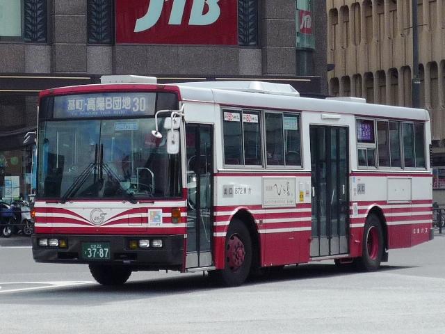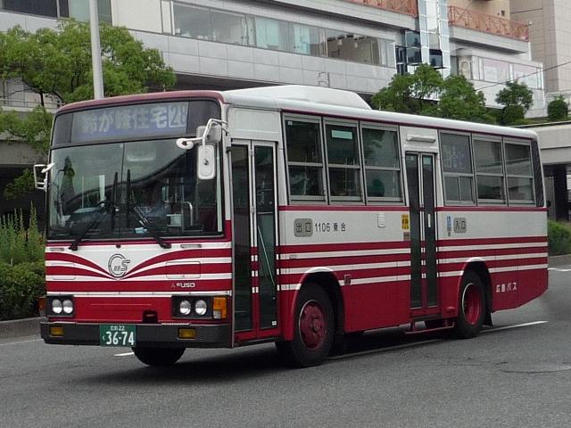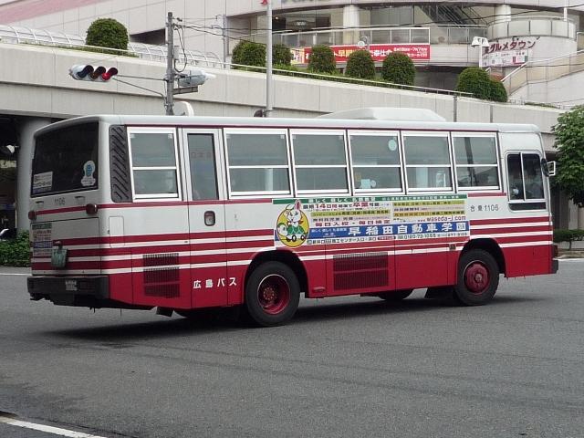広島で見たバスシリーズ。今回は広島バスの三菱ふそう・7Eボディを中心とした画像よ せ集め。ところで5Eはまだかね? 社番:865. 社番800代はふそう。UDの7Eボディと異なるところは特に無い感じ。 社番:885. 非公式側から。リヤでふそうと分かります。 872. PASPY対応なふそう。 882. 一部路線はバスセンターから発着。 2011. バスセンターからは広島空港リムジンバスも発着、広島バスのPJエアロ。エアロエース も登場しているようです。 1106. 中型バスは少数派、バスマガジンの全方位レポートによると2台のみとのこと。 画像のMK短尺が市内西部にあるアルパークからの28号線で活躍中。着発でグルグル 走り回り、運ちゃんの休憩時間は本数減とある意味分かりやすいダイヤとなっています。 PR