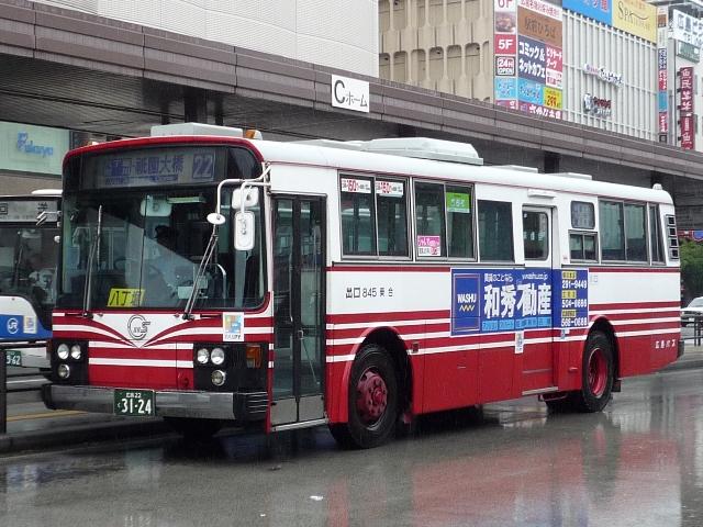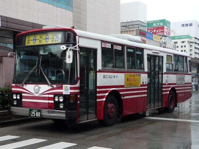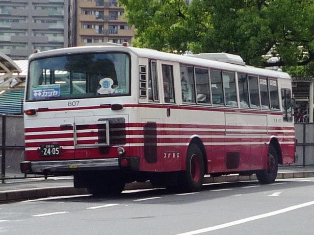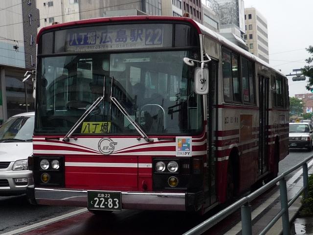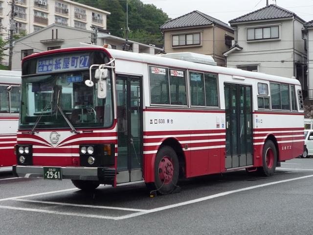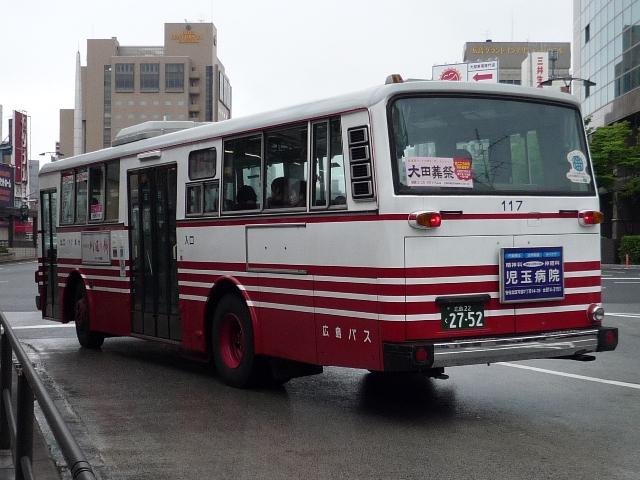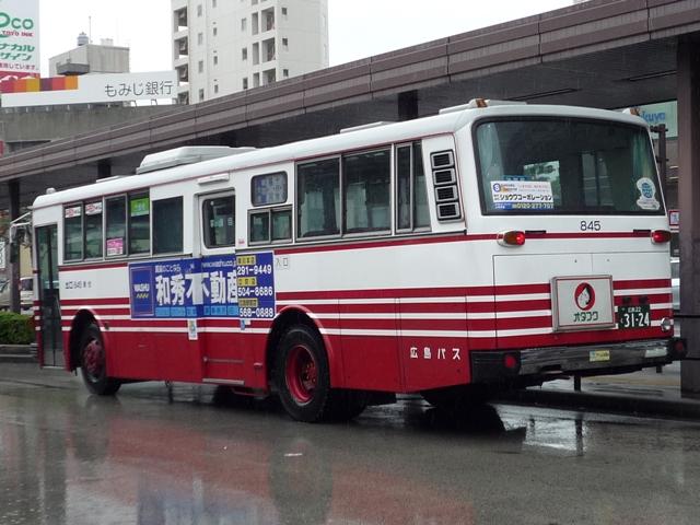 広島で見たバスシリーズ、広島バスのエントリが続きます。広島バスといえば、昔ななメ トロ、今5E。ということで、広島バスで活躍中の5Eボディの画像よせ集め。おそらく現時 点で現役の5Eボディ車が日本最多ではないかと思うほど、ごく普通に運用されています。 なお、型式・年式は「広島バス5E一覧表」『僕たちの大好きなバス』(2008),洋泉社 を参照しました。 社番:117.P-UA32L(87年車)。 まずはUDの5E。PASPY対応機器を取り付け活躍中。 801.P-MP518M(84年車)。 リベット付5Eも現役。さらにPASPY対応路線で活躍中。まさか2008年にリベット付が見ら れるとは、感激。 806.P-MP518M(84年車)。 807.P-MP518M(84年車)。 こちらは同年式ながらリベットレスボディ。MP118ベースということでリヤにルーバーが あります。 822.P-MP618M改(85年車)。 MP218ベースとなり、リヤのルーバーは無くなります。全引窓に4枚折戸といかにも広島 バスらしい仕様な5E。 838.P-MP618M(88年車)。 841.P-MP618M(88年車)。 型式から改が無くなった88年車。見た目変化無し。 845.P-MP618M(89年車)。 広島バスの5Eボディ納入末期には珍しく中引戸仕様が登場。担当者にどんな心境の変化 があったのでしょうか。 PR