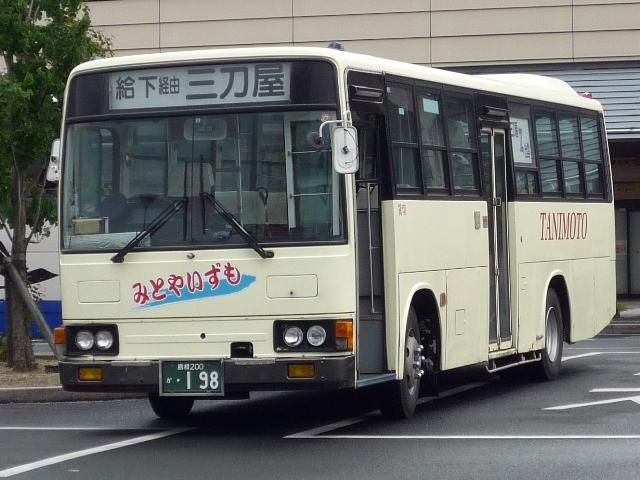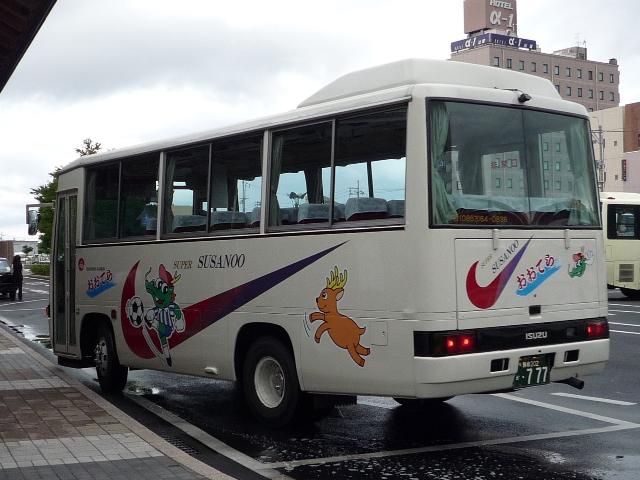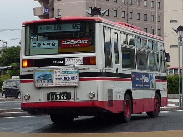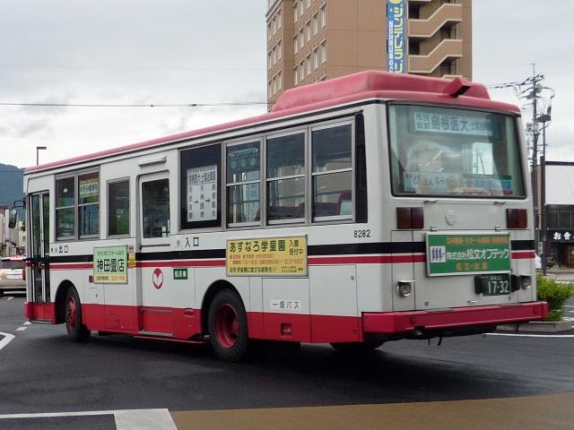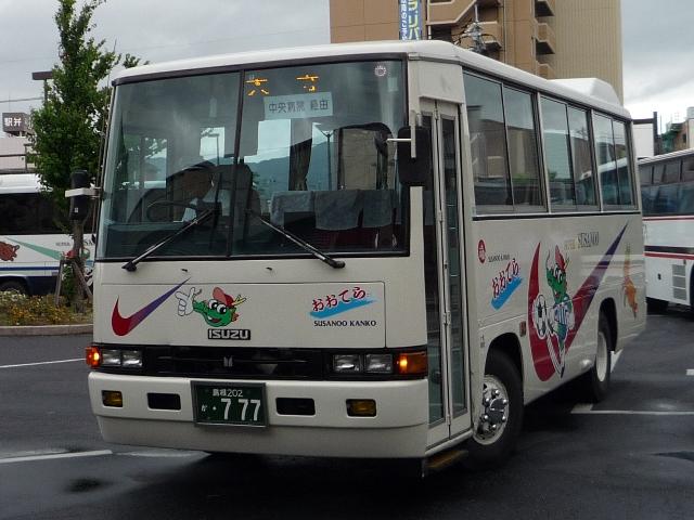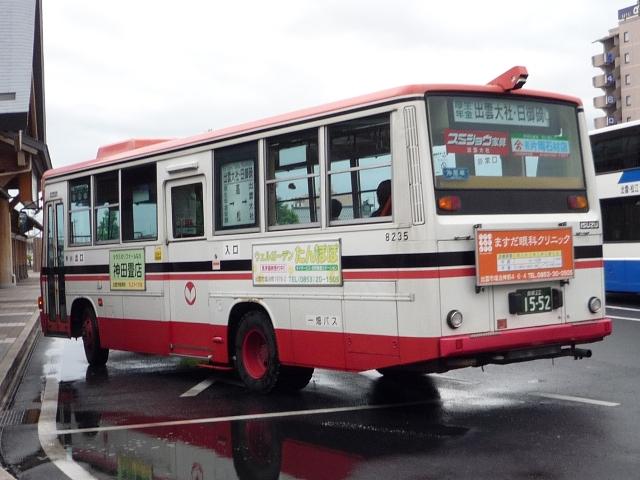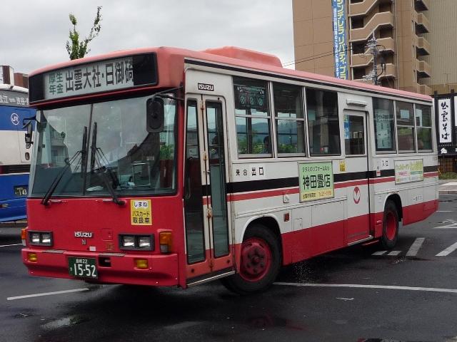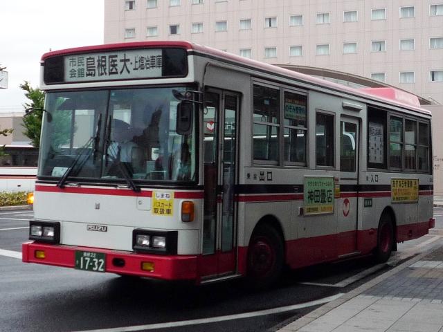 今回は出雲市で見たバス画像のよせ集め。出雲といえば出雲大社、縁結びということで 8282. 中扉横に「低床車」表示のある、西工LRも活躍中。 8328. 逆T字窓で「超低床車」な短尺LR。 8337. 出雲市内循環バスで使用されるエルガミオ。ナンバーや色からお察しの通り、元まつえ ウォーカー。オープンしたばかりの「ゆめタウン山陰」のラッピングも鮮やか。 出雲市駅では一畑バス廃止代替バスも見ることが出来ます。 スサノオ観光が代替運行する大寺線で使用されるMR。スサノオ観光は希望ナンバーで 「777」をつけているようです。 根波線で使用されるCH。固定窓+スイングドアな貸切車を転用。フロントガラス内にLE D行先表示を装備。 外園線はいかにも代替バスという感じの自家用タイプMK。この他自家用タイプのLRも。 三刀屋出雲線は谷本ハイヤーが運行。画像のやや厚化粧+お疲れ気味なMK路線車が 活躍中。出自が気になります。 PR