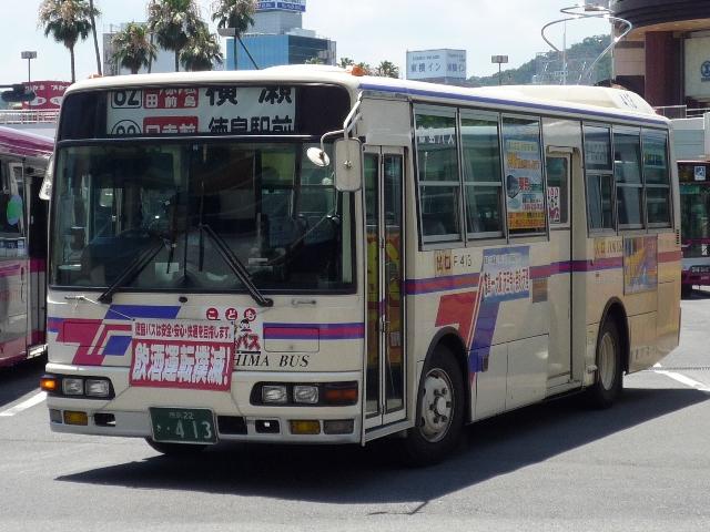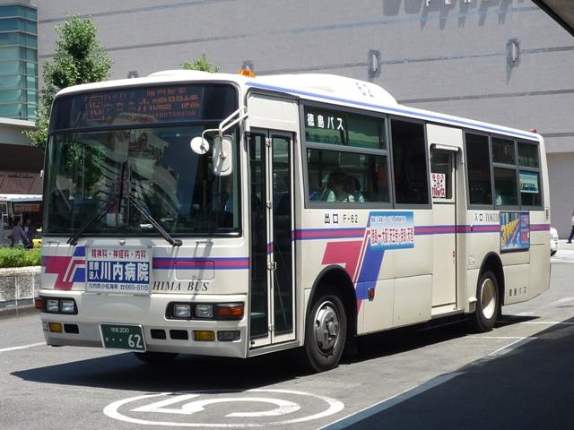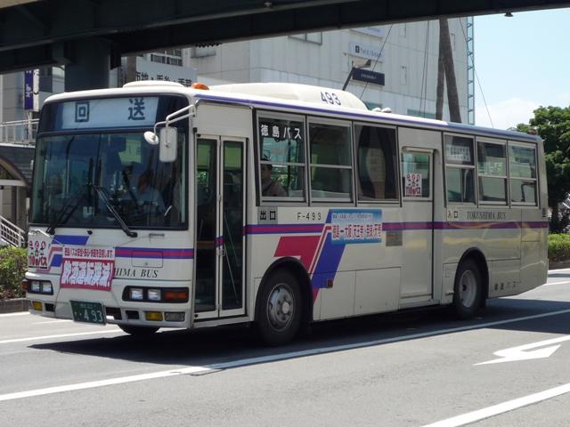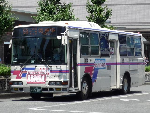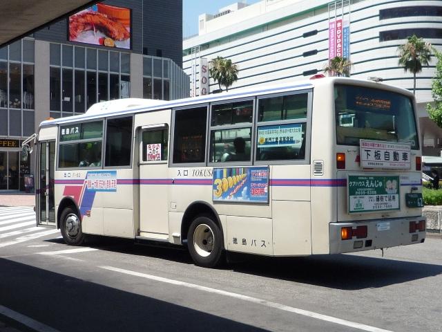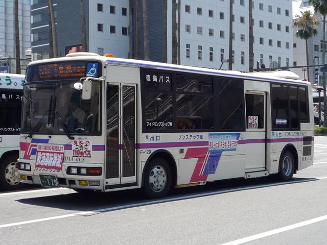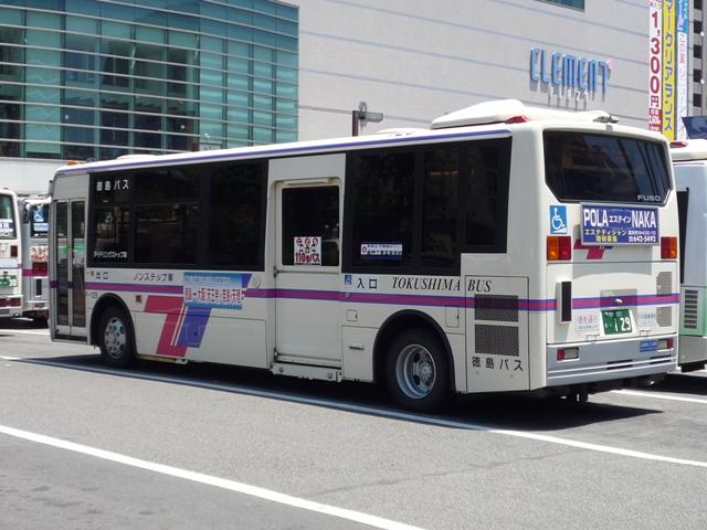 まだ続きます、徳島で見たバスシリーズ。今回は最近では少数派な印象のふそう路線車 の画像のよせ集めです。 なお、1999年までの導入車両の型式・年式は「徳島バス在籍車両一覧」『バスラマイン ターナショナル55号』(1999),ぽると出版と、『年鑑バスラマ』各号の「ノンステップバス 導入一覧表」を参照しました。 社番:F-360.KC-MK219J(96年車)。 リヤのみで失礼、見た中での古参車はふそうでもこのあたり。都内に匹敵する代替スピード。 社番:F-413.KC-MK219J(97年車)。 名物コーナリングランプはこのボディからバンパー組み込みとなりました。 少数派の大型路線車MPもみかけました。カメラを構えてないときに限って・・・。 F-493.KC-MK219J(99年車)。 F-496.KC-MK219J(99年車)。 方向幕車の例。 F-500.KC-MK219J(99年車)。 そしてLED車。見かけたふそう路線車は、側面の「徳島バス」表記が丸ゴシックなのがいまいち。 F-62. 末期の投入は逆T字窓での投入。しかしツーステップ。 F-129.KK-MJ27HL。 ふそうのノンステはこのタイプ、MJ9m。5台のみと少数派、MKノンステの投入はありま せんでした。以降HR→KRと投入が続いていることから、西工ARの出る幕は・・・。 PR