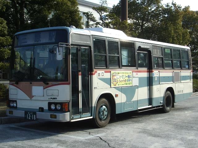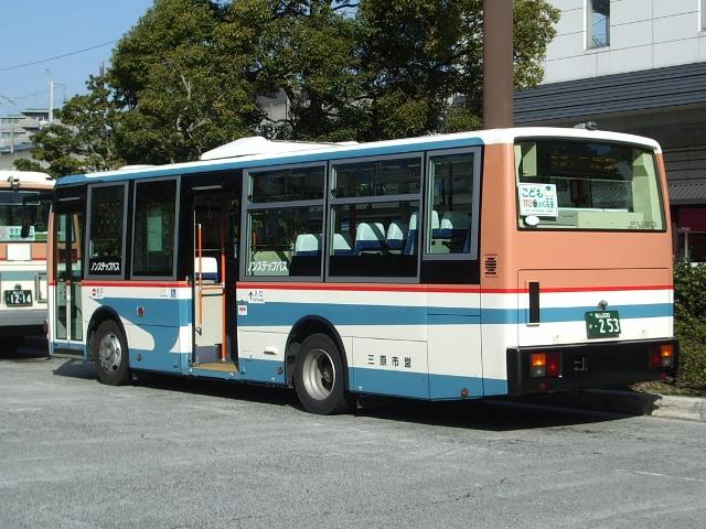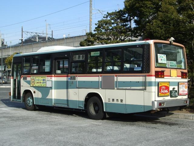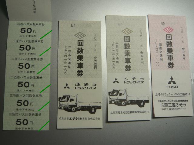 広島県の三原市では今年の3月まで「三原市交通局」として、市直営の路線バスを運行 していました。くしくも同日、隣の尾道市も「尾道市交通局」の運営にピリオドをうち、一挙 に2つの公営バスが消滅しました。尾道市営バスは翌日より第三セクターの「おのみちバ ス」として車両もそのままに運行を開始したことに対し、三原市営バスは近隣のバス事業 者に路線を移管し消滅しました。とはいえ、末期の三原市営バスの路線は三原駅を基点 に東西南北それぞれに延び、ほとんどの路線がそれぞれ異なる事業者との共同運行を 行っている状況でした。もはや公営バスを存続させる意義は少なく、運行の一本化はや むを得ないものと言えそうでした。 今回は第一次路線移管直前の2007年3月に見た三原市交通局のバス画像よせ集め です。それにしても結局広島県内のバス画像が続き、ネタ切れ感が漂います。 なお、2000年までの導入車両の型式・年式は「三原市交通局在籍車両一覧」『バスラマ インターナショナル62号』(2000),ぽると出版と、『年鑑バスラマ』各号の「ノンステップバ ス導入一覧表」を参照しました。 福山200か253.PA-MK27FH。 三原市営バスはふそう車メインで運行していました。数年ぶりに導入されたノンステMKが 結果的に三原市最後の新車となりました。 1217.U-MK517J(93年車)。 (福山22く)1218.U-MK517J(93年車)。 もっとも見かけたのはこのタイプのMK。それもそのはず93年に一挙10台が導入されま した。ちなみにこのMKは三原市営バスにとって9年ぶりの導入車両だったとか。 それにしても、午前中の三原駅前は運行前のバスを撮るには光線状態が厳しく、こんな 画像しか記録できなかったことは悔やまれます。 1422.KC-MP617K(96年車)。 エアロスターMボディの大型車。残念ながらサッシ窓で特注したというニューエアロスターを 見ることは出来ませんでした。 これらの車両は移管路線先の近隣バス事業社で活躍しているとのこと。結局三原にはこの 後、再訪できぬまま今に至ります。 せっかくなので回数券画像。表紙は発行時期によってデザインが若干異なりますが、基本的 には「三菱ふそう」の地域販社の広告が入っていました。車両購入の見返り?もあったのかも しれません。それにしても、いかにもカタログを切り抜いてコピーしました感のある「キャンター」 や30円券の角ばった販社「ふそう」ロゴがいい味出しています。 PR