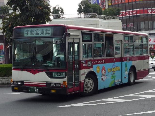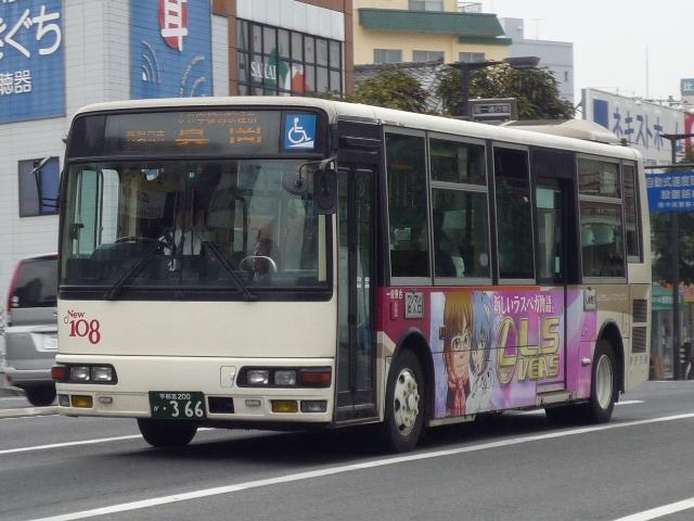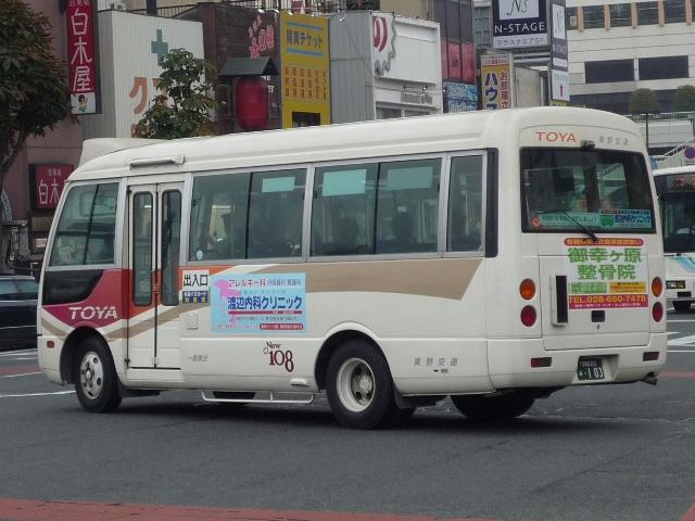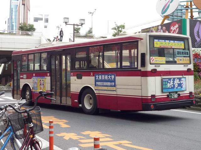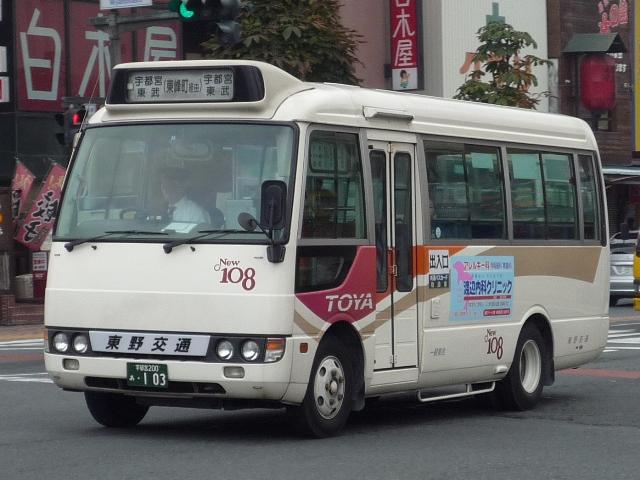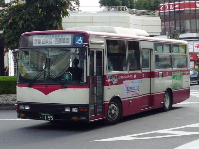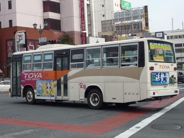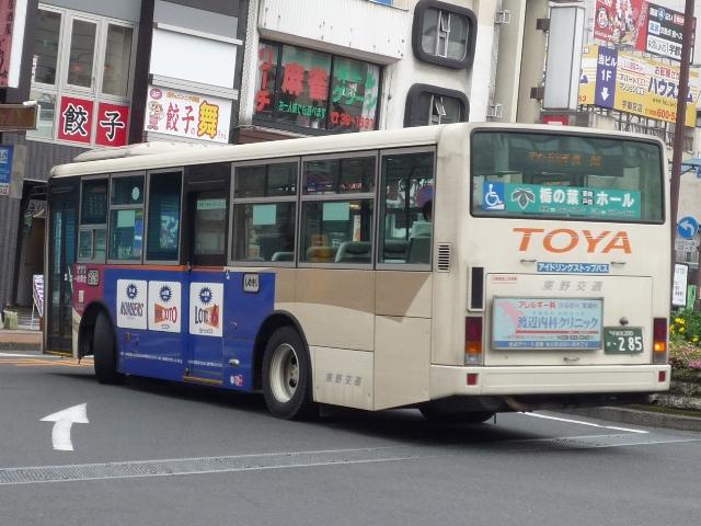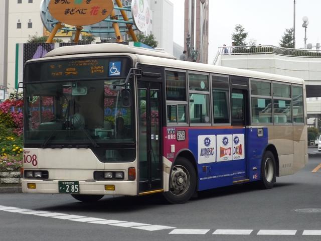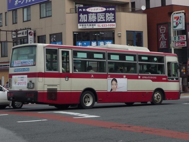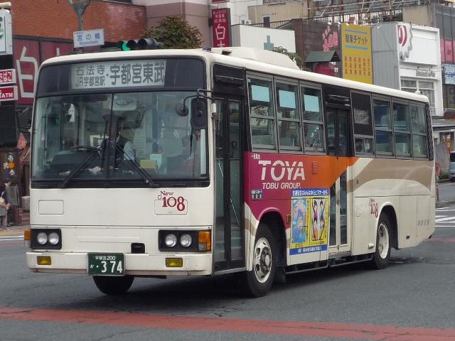 宇都宮で見たバスシリーズ。東野交通編その2は200ナンバーのバス画像よせ集めです。 目安としては東武グループ貸切色の塗装車までを取り上げています。 なお、型式・年式は『僕たちの大好きな鉄バスたち』(2009),洋泉社を参照し、追記して おります(2009年6月追記)。 宇都宮200か20.KC-MP317K(00年車)。 引き続き東野交通ではふそう車が続きます。前中扉のMPワンステップバス。 宇都宮200か155.KK-MK23HH(01年車)。 だんだん車両サイズが小型になっていきます。旧塗装のMKワンステ。 宇都宮200か280. このシリーズで初のふそう車以外の画像。阪東自動車よりグループ間移籍の日野富士。 東野交通は移籍車の活躍サイクルが短い感があり、まだ残っているとは思いませんでした。 リヤを見れば遠鉄と勘違いすることもありません。 ※参照文献の『鉄バス』に掲載が無いことから廃車となったようです。 宇都宮200か285.KL-MP33JK(02年車)。 このあたりから路線車も貸切グループカラーに変更。「108」の表記で東野を「ひがしの」と 読まないことに気づいた懐かしい思い出。 宇都宮200か366.KK-MJ27HL(03年車)。 いよいよノンステが登場。ふそう主体の地方バス会社ですから、やはりこれ。MJノンステ。 パチンコ屋のラッピング。 宇都宮200か374.U-MK517J(93年車)。 グループカラーの中型移籍車。正面「108」のロゴ位置が逆についていますが、特に決まり は無いのかも。しかし、前中扉折戸仕様にエアサスということでと出自が微妙な車両です。 宇都宮200あ103.KK-BE63EE(01年車)。 宇都宮市内路線にはこんなのも。おでこに行先方向幕を装備した短尺ローザ。 側面にも無理矢理感があるものの、きちんと行先方向幕を装備しているのはさすが。 PR