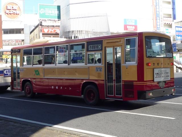 予告?どおり、先日水戸に出かけた際に見たバス画像を少々。 茨城方面のバスについては、大曽根線様をはじめ素晴らしいサイトやブログがたくさん あります。小生自身もそれらのサイトを見て知ったことも多く、いまさらこのヘボいブログ に物知り顔で書いてみてもたかがしれています。ということで、今回は画像と多少の感想 程度にとどめたいと思います。いつもと同じと言ってしまえばそれまでですが。 検索等で誤って覗いてしまった方には大変申し訳ありません。 なお、今回の茨城オートの車両の型式についてはリンク先でもあります、大曽根線様のブ ログを参考にさせていただきました。この場をお借りして御礼申し上げます。 社番:91J.P-RJ172BA。 茨城オートと言えば日野の中型車。 画像の91Jはナンバー的にも相当古い車両ですが、今なお現役の姿に感動。 社番:22J.P-RJ172BA。 旧塗装車は特徴的な「茨城オート 」の社名表記が残ります。 11J.P-RJ172CA。 若干明るい色となった新塗装車。車名表記が丸ゴシックとなってしまったのが個人的に残 念。それにしても茨城オートの社番は頭数字=元号と分からないと混乱します。 41J.U-RJ3HJAA。 新塗装は縁取りの黒帯も無くなり、従来の塗装イメージを踏襲しながら簡素化したところも。 161J.KK-RJ1JJHK。 正面の「ワンステップバス」のロゴがこれでもかと目立つRJ。 192H.U-LV324L。 近年は移籍車の導入がすすめられていますが、特に日野にはこだわらない様子。画像の LVは東武バスからの移籍車。茨城オートにはこの他、まさかの関東バスからの路線移籍 車RPも活躍しています。これを見たかったのですが、残念ながら小生とのタイミングは合 わず。ここでも宿題が出来てしまったのは残念でなりません。 <ちょっと前> 0251H. せっかくなので、3年ほど前に撮影した1枚。桜川車庫にて。 残念ながら画像のHTは東武や関東バスからの移籍車によって代替されたようです。 茨城オートといえば、水戸駅北口・南口到着を表す正面の丸板も個人的には必須アイテム。 PR
