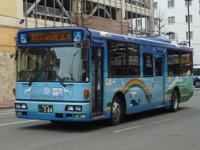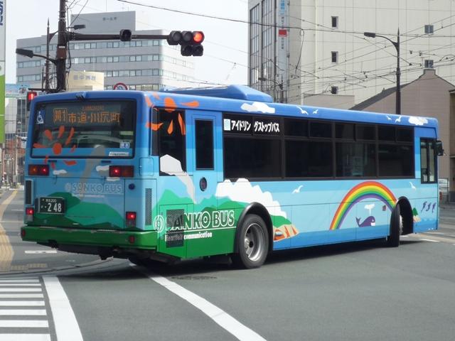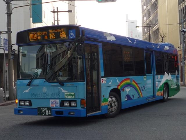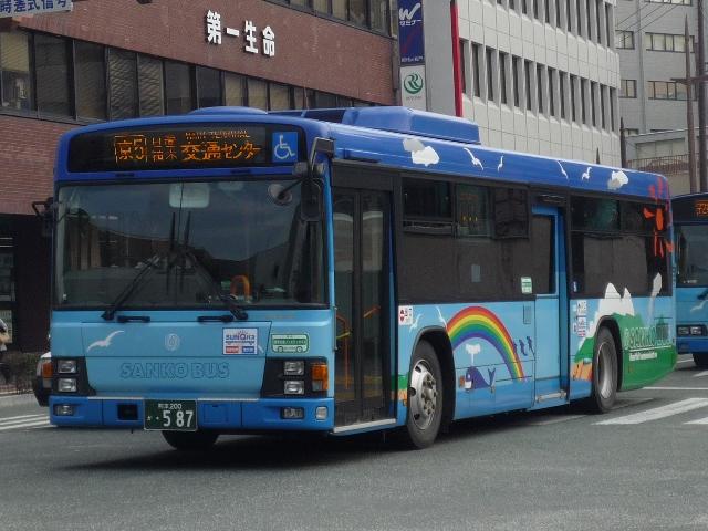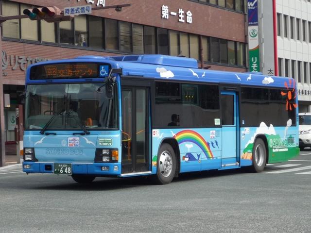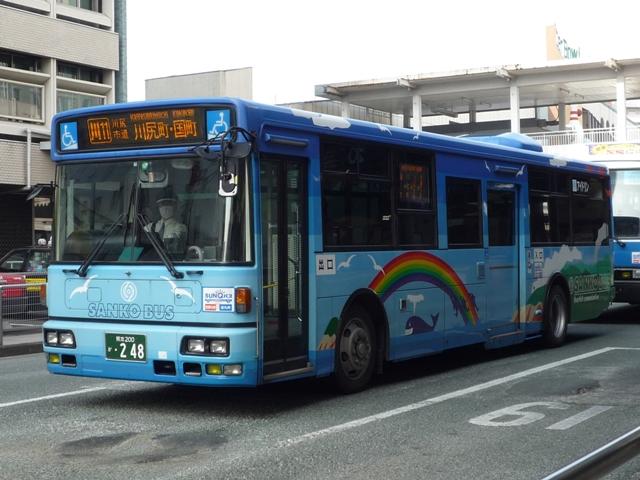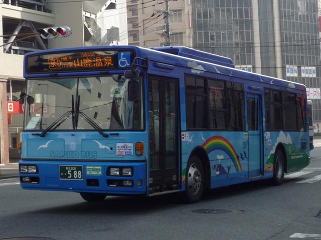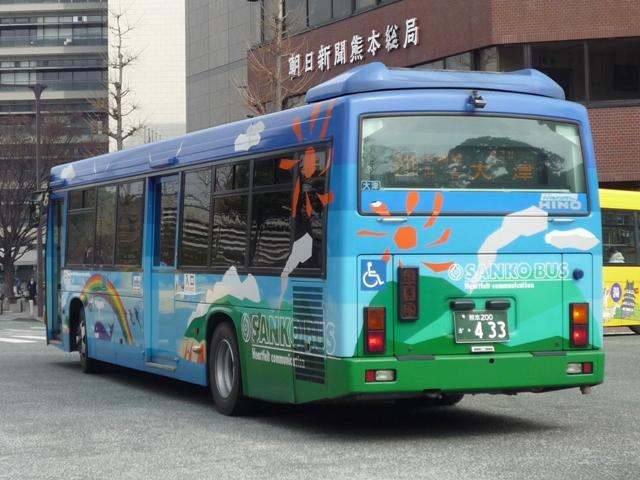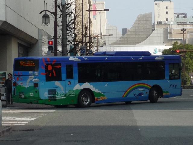 熊本で見たバス画像よせ集め。 今回は青空に可愛げなキャラクターでおなじみの九州産交バスで活躍するノンステップ バスの車両になります。前回の空港連絡バス同様に初度登録年の新しいものから順に KL規制車までを並べていきます。 型式・年式は「九州産業交通グループ在籍車両一覧」『バスラマインターナショナル107号』 (2008),ぽると出版 を参照しました。 熊本200か684. 最近の新車。ここ数年は、自社発注車はノンステ・移籍車はワンステを中心に何でもあり といった状況のようです。 熊本200か588.PKG-KV234N2(08年車)。 空港連絡バス用ノンステと同時期の導入。西工ボディのKV。 熊本200か587.PKG-LV234N2(08年車)。 こちらはLV、九州産交バスでは初のエルガとのこと。 KVは西工ボディなので、今のところ1つ目KVは在籍無し?なのでしょうか。 熊本200か584.BDG-HR7JPBE(08年車)。 大型ノンステだけでなく、中型幅の10.5mノンステも。九州産交バスではHRがノンステッ プバスの主力。国交省05年仕様ノンステのステッカーをフロントに貼付。 熊本200か433.PK-HR7JPAE(05年車)。 432.PK-HR7JPAE(05年車)。 05年は産交バスにRXが大量導入された影響からか、九州産交バスへの新車導入は 少なかった模様。一般乗合車はこの2台のみ。433には国交省仕様ノンステのステッカ ーが見当たらないのは気のせいなのか、内装が異なるのか。 344.KL-JP252NAN(04年車)。 UDのJPノンステも在籍。ここ最近はふそう・UDの導入が少ないようです。 熊本200か248.KL-JP252NAN(02年車)。 03年まではワンステップ車も並行して導入。その関係か、この頃のノンステップ車は中型 幅の10.5mノンステのみ導入。 PR