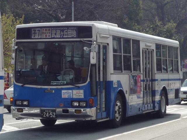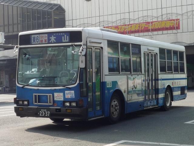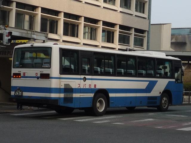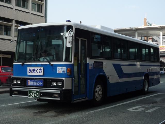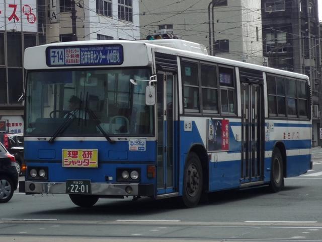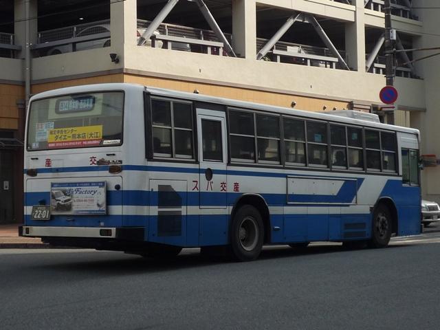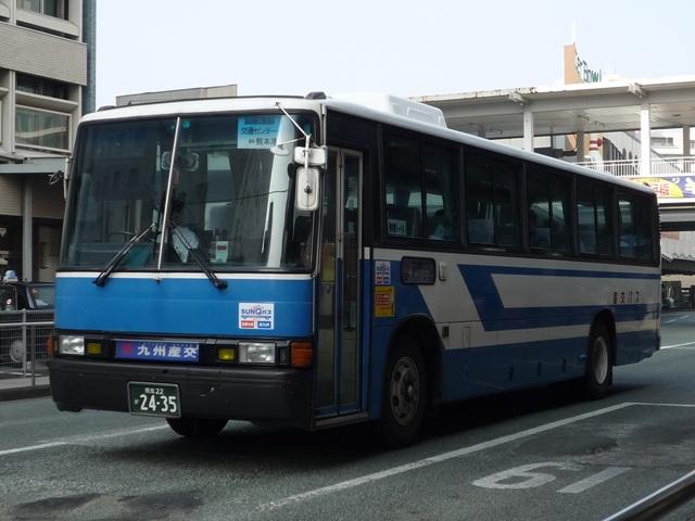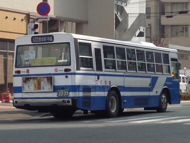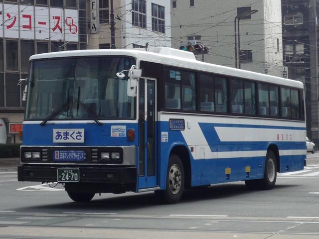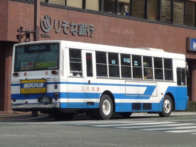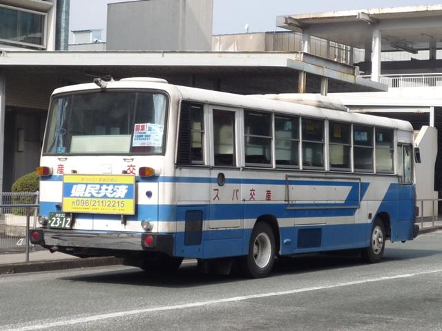 熊本で見たバス画像よせ集め。熊本4社(実際こういう呼び方はありませんが、便宜上と いうことで)二巡目になります。今回は九州産交のP規制車を並べていきますが、このあた りの年式の車両は、九州産交バス所属車と地域子会社を統合した産交バス所属車が混在 しています。あらかじめ御理解・御了承のほど宜しくお願いします。 型式・年式は「九州産業交通グループ在籍車両一覧」『バスラマインターナショナル107号』 (2008),ぽると出版 を参照しました。 熊22か1820.P-LR312J(86年車)。 見かけた産交バスの中で最古参ナンバーだったLR。「熊22」ナンバーは産交バスに在籍 しています。 熊本22か2201.P-HT235BA(88年車)。 大型車は前中扉、中扉4枚折戸が基本仕様。こちらは純正車体のブルーリボン。 一時期の産交バスは前面に広告掲示が出来る仕様となっていました。この車にある「理 研シャッター」は地場の企業のようです。 熊本22か2312.P-RM81G(89年車)。 中型車は前後扉が基本仕様。富士6EボディのRM。正面の広告掲示は折からの不況の 影響か空きスペースとなっている車両の方が多いように感じました。 熊本22か2333.P-MP218M(89年車)。 リヤからの画像だけですが、エアロスターMも活躍しています。 熊本22か2337.P-LV314M改(89年車)。 フロントのバンパーを交換したものと推測されるキュービック。 地域的に西工ボディが多いですが、P規制車は純正車体が目に付きました。 熊本22か2435.P-HU236BA(90年車)。 観光マスクのHU。空港連絡バスと同仕様ですが、こちらは熊本港シャトルバスで活躍。 熊本22か2443.P-UA33N(90年車)。 県内快速バスのあまくさ号で使用されるトップドア車。愛称サボがいい感じです。 熊本22か2470.P-HU236BA(90年車)。 登録番号が前後しますが、こちらは日野。リヤ側から見ないとさっぱり分かりません。 富士ボディ撤退から5年以上たち西工ボディも見慣れた存在になりますが、さすがに このE型ボディは東京在住の小生では新鮮と言うかなんというか。 熊本22か2452.P-LV314M改(90年車)。 正面の広告看板掲示枠が無く、メーカーエンブレムが付いたキュービック。 PR