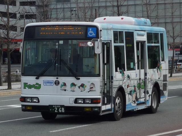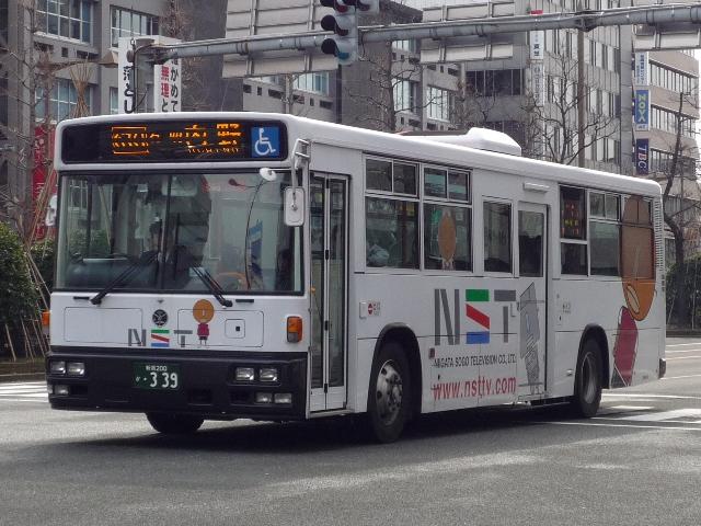 新潟駅前や万代バスセンター周辺で見た新潟交通グループの乗合車画像よせ集め、 今回は引き続き「新潟200か」ナンバーの一般乗合車両で、行先表示がLEDとなった 車両を並べていきます。 今回並べていく車両には、車体に社番(といっても登録番号+メーカー記号ですが)表記 がありません。しかし、拙ブログではあくまでも小生の「新潟交通と言えば」という誤ったイ メージ・気分的なものから表記の無い車両もあえて社番という形で紹介していきます。 あらかじめ御理解・御了承願います。 社番:H176-I. 行先表示機がLEDとなった、エルガワンステ短尺車。 社番:H186-M. 三菱ふそう車も同様。 社番:H193-N. 富士重工新7EボディのUAワンステ。やはり短尺のみ。 社番:H268-M. 新潟市観光循環バスで使用されるMJノンステ。車体は新潟市出身漫画家の作品キャラク ターをラッピングしています。ということで白山公園先回りに使用されるドカベン号。 社番:H269-M. こちらは朱鷺メッセ先回りに使用される犬夜叉号。 社番:286-I. 見たところ、このあたりの車両はラッピング広告車となっているものを目に付きました。 土日も営業中。 社番:H295-N. 富士重工のバスボディ製造撤退にともない、新潟交通にも西工ボディが登場。 社番:H339-N. 新潟交通では久々に登場したUDの長尺車。 社番:H382-I. 屋根上冷房機器がデンソーの現行タイプとなったPJ規制車のエルガ。 社番:H398-N. こちらは尿素エンジン搭載のRAワンステ。 PR