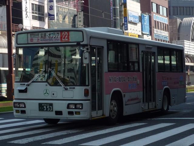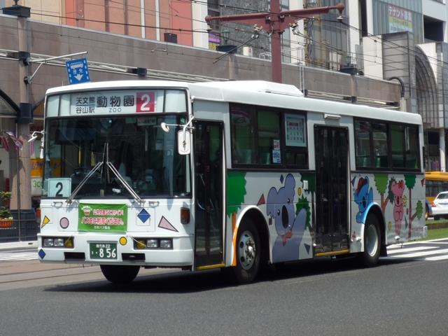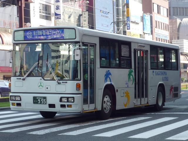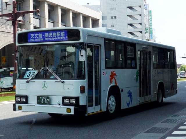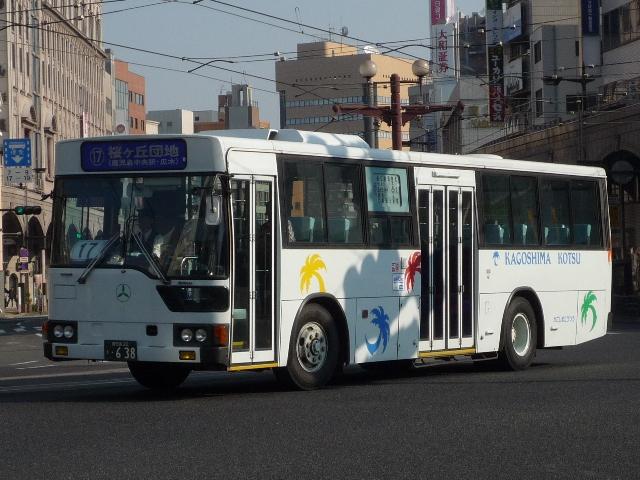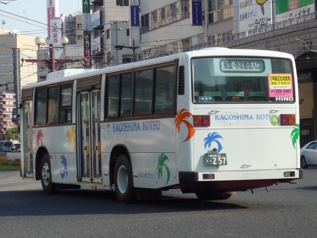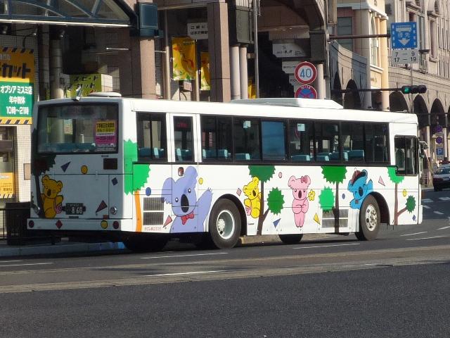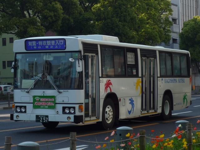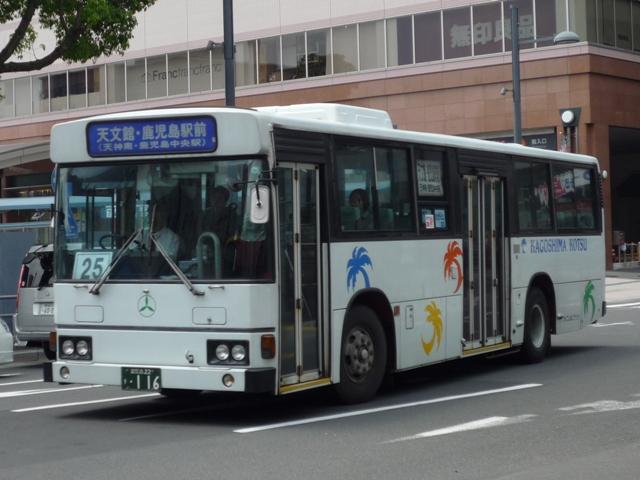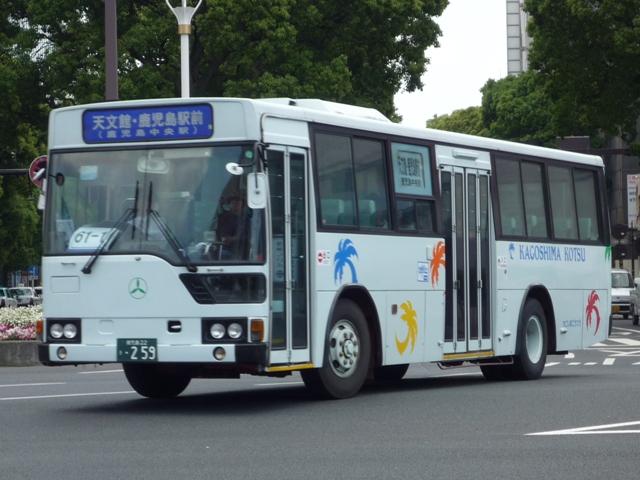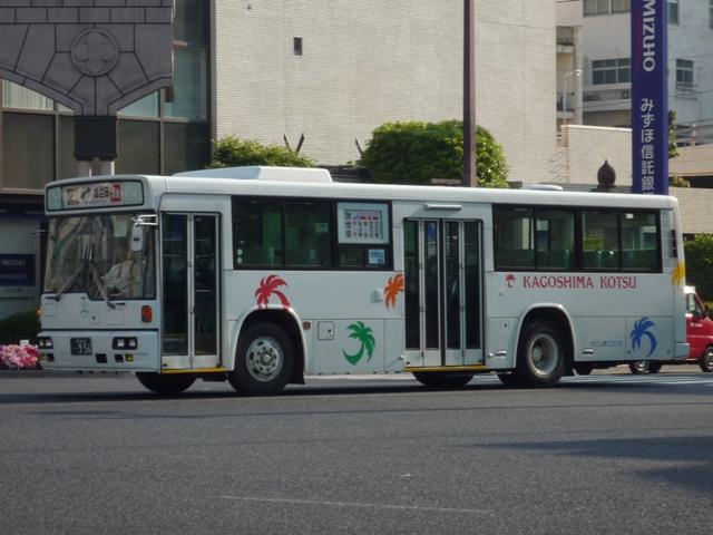 GWに九州で見たバスシリーズ。 今回は近年、多くのバス路線廃止や鹿児島市交通局運行のバス路線に競合する形で新 路線を展開するなど、良くも悪くも話題に事欠かない「官」より「民」ですこと、いわさきグル ープの筆頭バス事業者、鹿児島交通を中心としたバス画像よせ集めです。 まずは鹿22か、鹿児島22きナンバーの車両を並べていきますが、一部大隈交通ネット ワークの車両も含まれています。 なお、型式・年式は「鹿児島交通 在籍車両一覧」『バスラマインターナショナル65号』 (2001),ぽると出版 を参照しました。 鹿22か1585.P-MP618M改(87年車)。 ということで、早速大隈交通ネットワークの車両から。社名は側面下部に小さく入るだけで、 ヤシの木マークやKAGOSHIMA KOTSUのロゴが目に付きます。 鹿児島22き116.P-HU235BA改(88年車)。 中扉4枚折戸に側面は全引違窓にエアサスというのが鹿児島交通標準仕様。 ここ数年移籍車導入が進められていますが、このあたりの古参車もまだまだ活躍中。 鹿児島22き257.P-HU235BA(90年車)。 側面のカラフルなヤシの木マークは岩崎グループのCIで制定されたもの。車両ごとに色が 異なりますが、これは現場裁量で貼り付けられたものだからとか。 鹿児島22き259.P-MP618M改(90年車)。 P規制車のエアロスターM。 鹿児島22き638.U-MP618M(93年車)。 U規制車のエアロスターM。扉に出入口表記がありませんが、いわさきグループではデフォ。 鹿児島22き856.KC-UA460LAN(96年車)。 鹿児島22き860.KC-UA460LAN(96年車)。 市立平川動物園を結ぶ路線の専用車として活躍するUA。車体にコアラを描いた特別塗装 が特徴。当初は市内の百貨店がスポンサーとなっていたようですが、現在はそれらしき表記 は見当たらず。 鹿児島22き887.KC-UA460LAN(96年車)。 この年はUAを西工ボディでも導入。鹿児島交通に58MCはそれなりに在籍しているはず なんですが、見かけたのはこの1台のみ。どうもタイミングが合わなかったようです。 鹿児島22き953.KC-UA460LAN(97年車)。 97年に導入された西工ボディあれこれ。まずはUD。 鹿児島22き955.KC-LV280N(97年車)。 続いていすゞ。これは見分けられます。 鹿児島22き956.KC-HU2MMCA(97年車)。 そして日野。見ることは出来ませんでしたが、連番で西工ボディの三菱ふそう車も在籍してい るようです。全メーカーを同じボディで導入するとは、また手の込んだ・・・。 PR