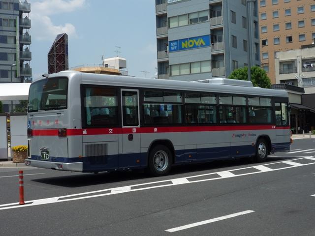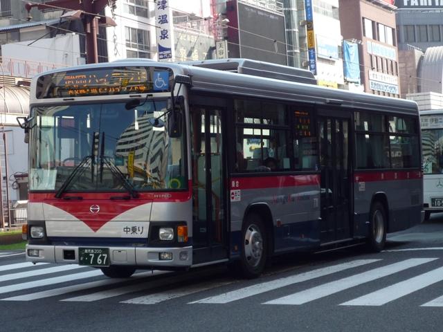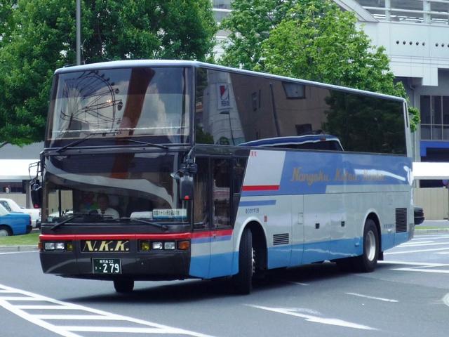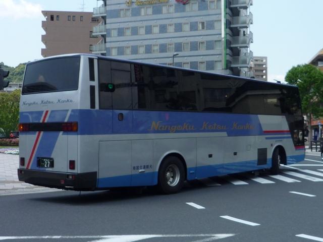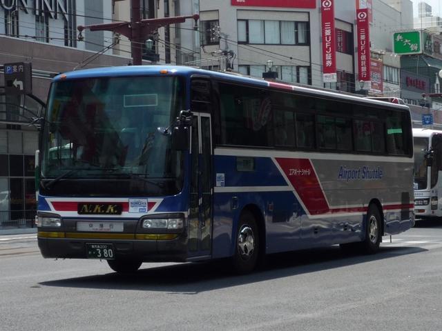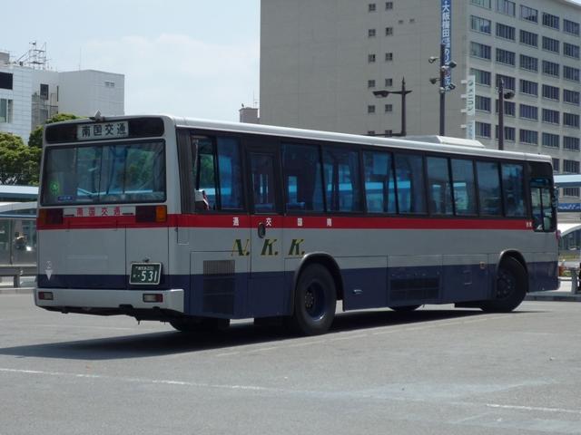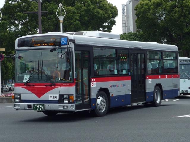 GWに九州で見たバス画像のよせ集め。 引き続き、南国交通のバス画像よせ集めです。 今回は鹿児島200かナンバーの一般路線バス車両とエアポートシャトルや高速車、グ ループ会社の観光車を並べていきます。 なお、型式・年式は「南国交通 在籍車両一覧」『バスラマインターナショナル94号』 (2006),ぽると出版 を参照しました。 鹿児島200か531.U-MP218N改(93年車)。 南国交通でも少数ながら移籍車が在籍。2005年に登場した東洋バスからの移籍車。 ヘッドライト周りが何故か銀色で塗装され異彩を放ちます。全引違側面窓に中扉4枚折戸 と南国交通の仕様に近いといえば近いのですが・・・。内装は団地路線らしい背もたれの 低い1人がけシートが並ぶ東洋バス時代のままです。これまで限られた運用のみで活躍 していたようですが、2009年から開始された鹿児島市交通局との相互乗り入れ運用に入 っていることが多いようです。小生的に気になっていた東洋バス移籍車をこうして記録する ことができましたという話。 鹿児島200か767. 最近の新車から、1つ目KV。近年の車両は「Nangoku Kotsu」とこれまでの「N.K.K」 を髣髴させるような表記に変更されました。 鹿児島200か774. 鹿児島200か773. 登録番号が前後しますが、こちらはLV。メーカーごとにエアコンをデンソーとサーモキン グと分けているのが律儀です。 <エアポートシャトル> 鹿児島200か380.KL-RU4FSEA(04年車)。 鹿児島空港へのエアポートシャトルで使用される折戸仕様のセレガ。鹿児島市内を結ぶ路線 は南国交通の稼ぎ頭らしく積極的に新車を導入しています。共同運行の「いわさき」車と比べ ると随分差が・・・。 <高速車> 鹿児島200か270.KL-MS86MP(03年車)。 側面固定窓仕様の高速車。塗装はエアポートシャトル同様です。 <貸切車> 鹿児島22き279.P-LV719R(90年車)。 こちらはグループ会社の南国交通観光の貸切車。いすゞのUFCですが、同社では2階建て サロンバスと呼ばれ、「るりかけす号」の愛称を持つフラッグシップ車です。 PR