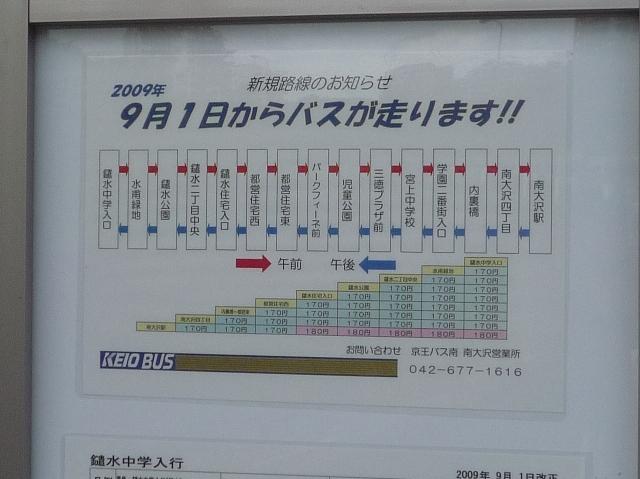 忘れたころに更新すると言いながら、前回更新から約1ヶ月しかありません。京王バス南 「南大沢営業所」の話題。沿線住民ということと、他に更新するネタのモチベーションが上 がらないことが分かっていただければ幸い。 なお、ここに書き連ねる小生的感想はあくまでも「京王バス南で」という基準です。 あらかじめ御了承のほどお願いします。 話題その1.新規路線開設。 これまで南61系統の「都営住宅西」起終点だったものが路線延長。 ここ数年宅地造成がようやく進みつつある鑓水2丁目界隈を一回りして鑓水中学校入口ま での路線を新設。新設区間は画像を参照。 南大沢営業所への入庫経路が新設区間を一回りすることで都営住宅西よりもスムーズに なった感。一部の「多摩美術大学」への便もこちらに振り分けられました。 せっかくなのでバス停画像も。実は鑓水中学校への最寄バス停「鑓水公園」。 運行時間は早朝と夜間のみと、いかにも出入庫便を営業していますといったところで、車内 に路線延長の掲示も無く、話題にもならずひっそりしたもの。運行への意気込み具合が分か ります。まあ新設路線経路の大部分が造成中ですから、経費もかけられないのでしょう。 話題その2.RNの代替新車。 社番:M20919. 社番:M20917. 社番が前後し失礼します。 97年に大量導入したRNの代替がいよいよ本格化、京王バス南では06年のKV以来の日野 車となる1つ目KRを導入開始。年初は三菱ふそう車の導入だっただけに、RNの代替がKR とは正直予想出来ず。エンジンや予備部品を考えればRM・ARが順当とも思うのですが。 RNメインの路線を中心に活躍する姿を見かけることも多くなりました。 PR