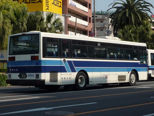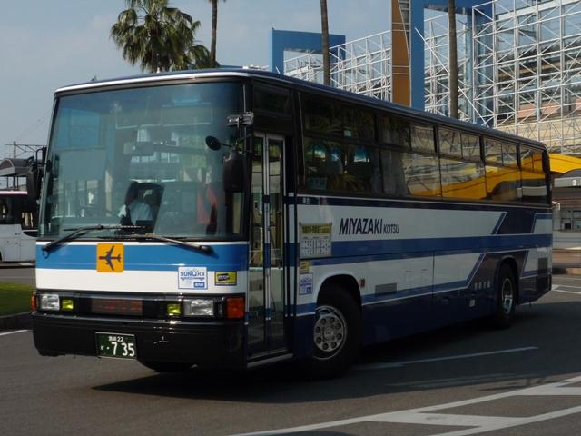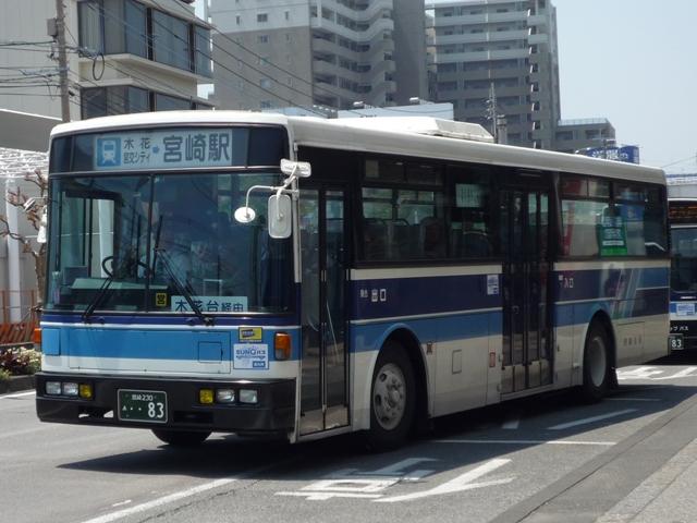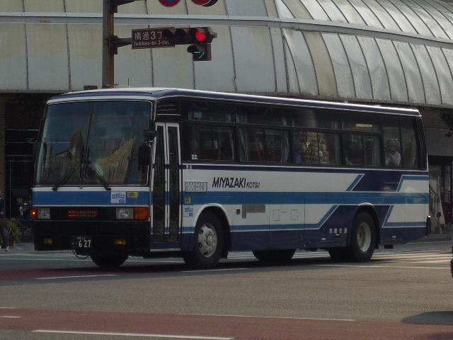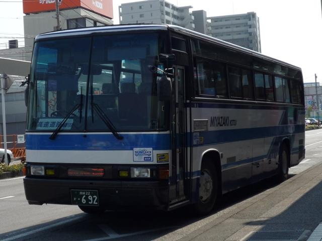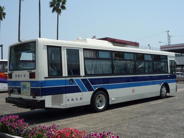 GWに九州で見たバス画像シリーズ。 今回は宮崎交通で活躍する長さ9m超の車両画像を並べていきます。 なお、型式・年式は「宮崎交通所有車両全データ」『バスマガジン16号』(2006), 三推社/講談社を参照しました。 宮崎22か894.P-UA33N(90年車)。 まずは路線バスボディの車両から。宮崎交通では久々の路線バスボディ大型車を89年に 導入。翌年はL尺からN尺へと長くなり追加投入しました。記録できたのはN尺の車両ばか り。画像の車両は県民共済スポンサーのラッピング車ですが、旧塗装をイメージしたもの でしょうか。 宮崎22か947.P-UA33N(90年車)。 せっかくなのでリヤからの画像も。ハイバックシートが並びます。 宮崎230あ83.P-UA33N(90年車)。 一部の車両は希望番号となっています。