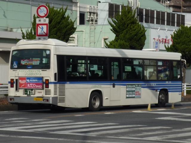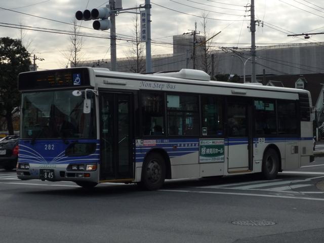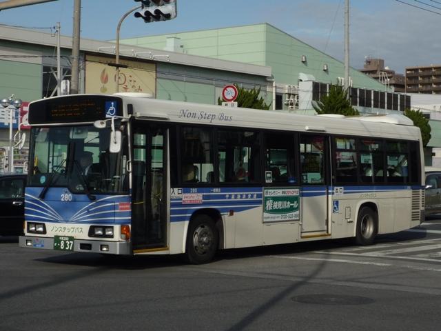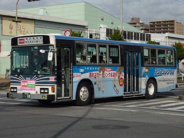 色々と忙しく、早くもブログの1ヶ月12回更新という目標が重石に感じるこのごろ。 先日、と言っても2009年ですが稲毛駅周辺をふらつく機会があり、千葉海浜交通の車両 を何台か記録することが出来ました。今となっては何故3扉車が活躍していた頃に、もう少 しまともな構図で記録してなかったのかと後悔しています。いつまでもありふれた存在であ るとは限らない、だからこそ、おろそかにしてはいけないということです。 前置きが長くなりましたが、拙ブログではおなじみのバス画像を並べていくエントリー。今回 は2009年歳末に見た千葉海浜交通の車両です。 社番:263. 大型乗合車の標準仕様は長尺3扉だった千葉海浜交通ですが、NOx・PM法による代替 で全車退役済み。現在の古参格は中扉4枚折戸に仕様変更したこのあたりの車両です。 アクアリンクちばのラッピング車。 社番:264. 京成電鉄(当時)の一部路線を引き継いだこともあり、中型車も在籍するようになりました。 当然ながら日野の中型車を導入し、一部に京成からのグループ間転籍車も在籍していまし た。当然ながら転籍車は既に代替済みで、そろそろこのあたりのグループもというところ。 画像の車両はこちらもアクアリンクちばのラッピング車ですが、大型車とデザインが異なり ます。 社番:275. BRCのワンステップ車。このあたりの導入まで帯塗装が京成電鉄直営時代のバスに長い 間使用されていた旧カラーに似た黒っぽい紺色でした。 社番:280. 社番279から塗装デザインはそのままで明るい青色に変わり、爽やかになった感。 2003年に千葉海浜交通初のノンステップバスが登場、まずはHRの10.5m。長尺3扉 の代替にHR10.5mですから、団地の通勤通学需要が減少してきたことを意味するダウ ンサイジングです。 社番:282. HRと同時期に導入したBRC大型ノンステップ車。この頃の日野大型ノンステップ車はフル フラットのため後部にデットスペースが多いイマイチな車両。 社番:290. 増備が続くHR。国交省標準仕様ノンステップ車となった頃。 PR