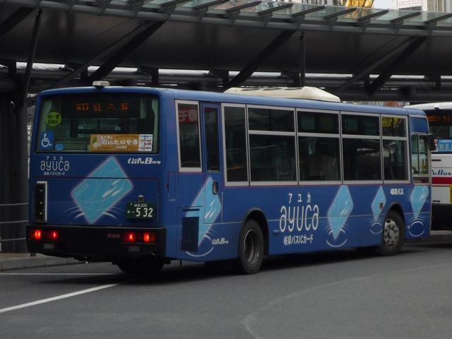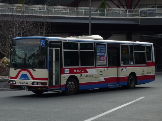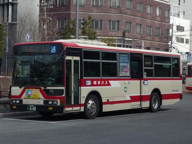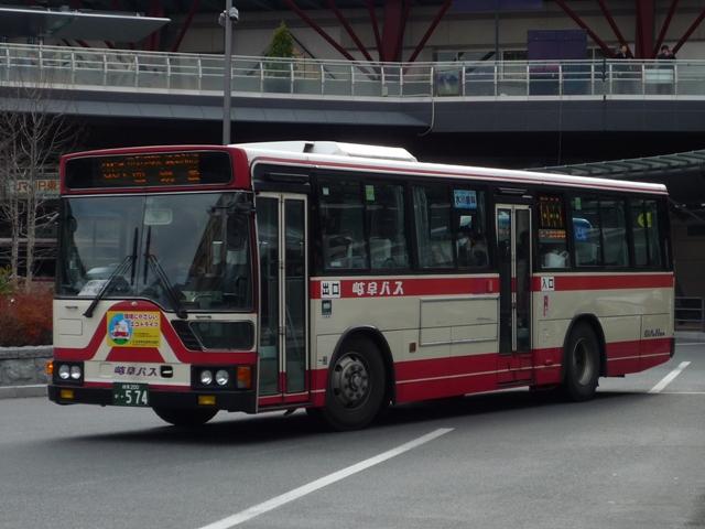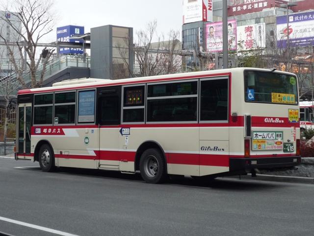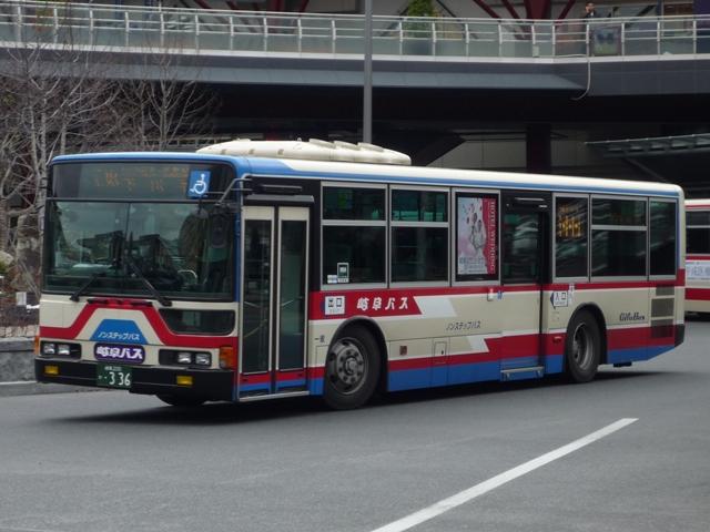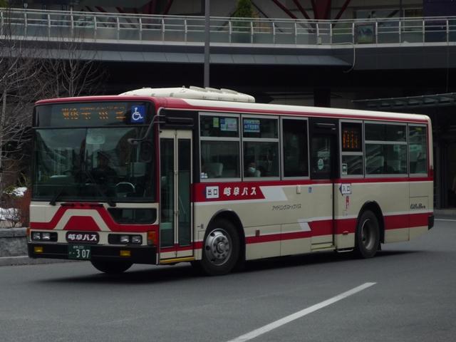 2009年の12月に大垣や名古屋へ出かけた際に見たバスシリーズ。 今回は岐阜乗合自動車で活躍する岐阜200かナンバーで地色がクリーム色の車両を並 べていきます。相変わらず細かい括りで更新回数を稼ぎます。 なお、型式・年式は「岐阜バスグループ 在籍車両一覧」『バスラマインターナショナル 123号』(2010),ぽると出版 を参照しました。 岐阜200か307.KL-MP35JM(02年車)。 正面に「岐阜バス」行灯があるニューエアロスター。前回並べたのがいわゆる「岐阜塗り」と 呼ばれる現行カラーに塗り替え後の車両でしたので、ここで並べる意味は一応あるのかと。 岐阜200か336.KL-MP37JM(03年車)。 岐阜乗合自動車ではエアロスターのノンステップバスを所有していたことでも知られていま すが、ノンステップバスの本格的な導入はこのあたりから。ご覧のような青色が配色された ノンステップバス専用カラーでした。 岐阜200か385.KL-MP37JM(03年車)。 せっかくなのでリヤからの画像も。後面は青色が全く無いところがポイント。