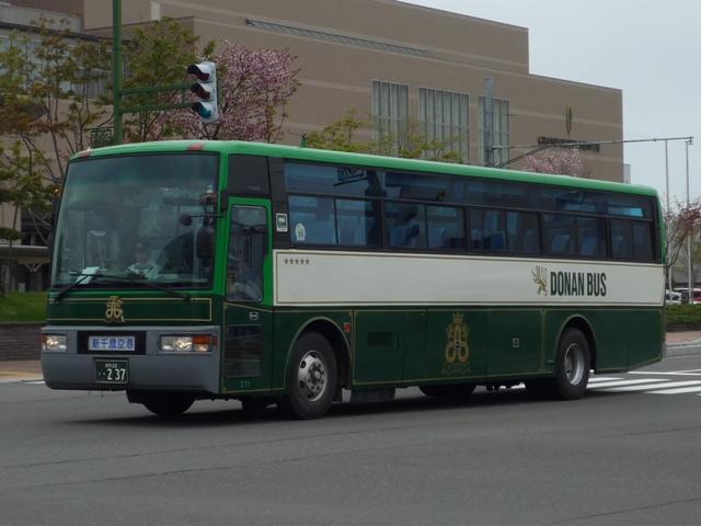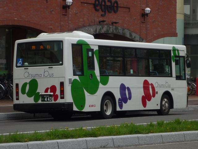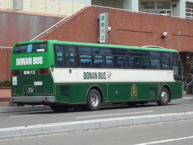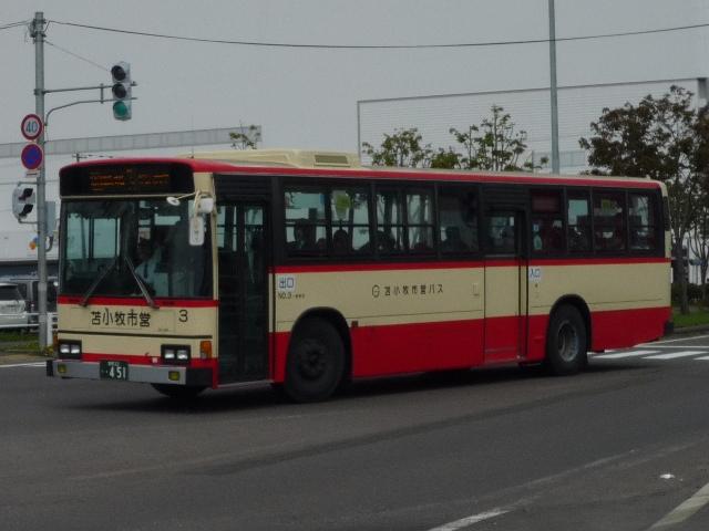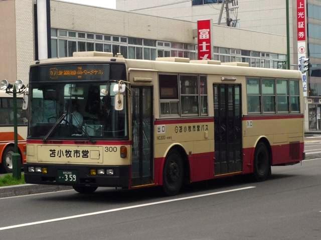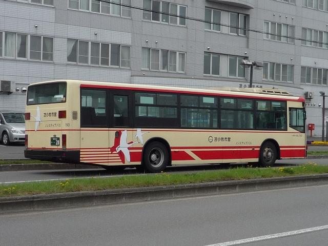 5月の下旬に約10年ぶりとなる北海道へ出かけました。沖縄ネタの次は北海道と極端 なことになりますが、並行して更新していきますのでお付き合いいただければ幸いです。 また新たに「バス(北海道)」カテゴリーを作成し、地方運輸局毎のバス画像が揃うこと になりました。 北海道ネタの第一回目は苫小牧駅周辺で見たバス画像よせ集めです。道内有数の港 湾都市ということで、苫小牧駅前は商業施設などそれなりにありますが、残念ながら閉 鎖したままの店舗もあり、元気は感じられず閑散としている印象をもちました。 室蘭200か406. フジタバスこと藤田荷役が運行を担当しているイオン苫小牧ショッピングセンターへの送迎 バス。苫小牧といえば移籍車マニアとしては欠かすことが出来ない1台で、見たままそのま まな東武バスからのワンステップLV移籍車です。閑散とした駅前で唯一混雑していたとこ ろが、イオンへの送迎バス乗場というところに、地方都市における商業地の中心は郊外の 大規模ショッピングセンターであることを実感した次第。 しかし東武バスがよくOKしたなと思うそのままっぷりです。まあクリーム地にオレンジという カラーはフジタバスの塗装ともいえるのですが、観光車のカラーもどこかで見たようなデザ インなんですが・・・。 <道南バス> 社番:211.U-RA520TBN(92年車)※1。 室蘭を中心に路線網を展開する道南バス。苫小牧駅前からは、新千歳空港への路線や 札幌への都市間高速バス「ハスカップ号」が中心。ちなみに社番は扉下にあるのですが、 色調が似ていたりと非常に見難い印象。 <あつまバス> 室蘭200か443. あつまバスも苫小牧から厚真への路線が乗り入れています。本数は多くありませんが、 いくつかの経由でが存在します。画像はUDのワンステップ中型車。ほかにも西武バスか らの大型移籍車なども見ることが出来ました。 <苫小牧市交通部> 車番:3.KC-HU2MPCA(96年車)※2。 長尺車が揃う苫小牧市交通部。まずは日野HU。 車番:87.U-MP618P(91年車)※2。 こちらは三菱ふそうの長尺車。このあたりの導入まで、一般乗合車は道内事業者らしく非 冷房仕様でした。 車番:150.KC-MP747M(99年車)※2。 ノンステップバスも1台在籍。記録できたのはリヤのみ。正面からの画像は他所様でお探し いただくとして、ノンステップバスはデザインをアレンジした独自塗装。 車番:300. 経費削減のため導入した移籍車。移籍車の車番は300番台としているようです。 まずは東京都交通局からのいすゞLV富士ボディ。 車番:313. 東京都交通局が知事の意向により廃車両売却を中止したため、当初予定していた導入台 数が揃わないことに。公営バスつながりで川崎市交通局から導入したキュービック移籍車。 今回苫小牧を訪れたのは、全国の公営企業形態による「市営バス」に乗るため。苫小牧市 交通部は道内で唯一となった市営バスです。型式等を参照した『バスマガジン8号』によれ ば、錦西営業所の道南バスへ業務委託するなど人件費を中心とした経費削減で2003年 度には黒字を達成しました。しかし経費削減だけでは乗客減に歯止めがかからない現状で は抜本的な解決にならず、加えて苫小牧市自体も厳しい財政状況ということもあり2012年 度から道南バスへ完全民間移譲が決定しています 駅前にある立派な市営バスターミナルですが、現状の運行本数に比べて乗り場数が多す ぎて、利用しやすいとは思えない状況。道南バスへの移譲でどうなるのか気になるところ です。おそらくは現状のままか、もしかすると資産売却の関係で閉鎖されるのかもしれま せんが、願わくば道南バスやあつまバス、都市間高速バスなど一体利用の出来る施設と して活用してほしいものです。 苫小牧市営バスを目的としながら、リサーチ不足で記録も乗車も中途半端に終わりました。 反省点をふまえて再度リベンジしたいところです。 なお、型式年式は下記文献を参照しました。 ※1):「道南バス 在籍車両一覧表」『バスラマインターナショナル66号』(2001),ぽると出版。 ※2):「北の大地で走り続ける北海道最後の公営バス 苫小牧市交通部」『バスマガジン8号』 (2004),三推社/講談社 PR