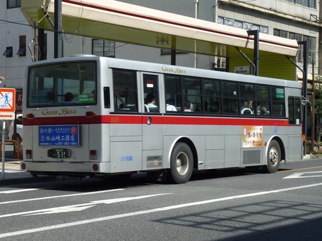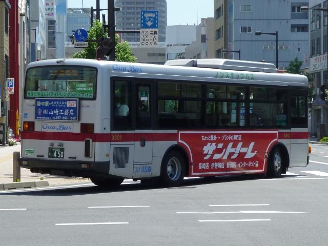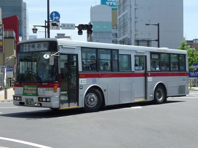 7月下旬の体温を超える暑さの中記録したバス画像よせ集め、「高崎で見たバス2010」。 前回の群馬バス編その1で日野車を並べていきましたが、今回はUD車と三菱ふそう車、 そしてボディ裾部に青色の無い旧塗装のいすゞ車と、無理矢理な括り方で更新回数水増 しを図ります。 <UD> 社番:6169. まずUDのRM中型車、車内はパイプ椅子が並ぶ往年の群バス仕様。 なお、このブログでは日産ディーゼル時代に製造された車両もUDとして表記します。 社名変更以前から日産ディーゼルを「UD」と呼んでおり、ブログ内でも長らくUDと表記し てきた為です。こだわりのある方からすれば受け入れられない表記方法かもしれません が、御容赦願います。 <三菱ふそう> 社番:5127. 路線車では少数派の三菱ふそう車。今回見た車両も元東急コーチなMK移籍車だけ。 2008年に見たときと同様にしんとう温泉への路線で運用していました。 三菱ふそう車といえば群馬名物「京阪移籍車」のエアロスターKも在籍していたのです が・・・。既に代替済みかもしれません。 <いすゞ> 社番:63260. 富士6EボディのLR。今回引退した1つ目RJと同時期に導入した群22ナンバー車です。 「ぐるりん」で活躍していましたが、8月に行われた路線改変でどうなったか気になります。 社番:63267. こちらは群馬22ナンバーのLR。このあたりの車両もそろそろ代替となるのでしょうか。 なお、5桁社番の頭数字は営業所を表していましたが、撤退・縮小で現在は省略されて います。 社番:3299. 群馬バスで初導入したエルガミオのノンステップ車。画像の3299と3300の2台が現在、 イオンカラーとなりイオンモール高崎線専用車となっています。 社番:3301. こちらは国交省仕様ノンステップバスとなったPA規制車のエルガミオ。WB間の「サントノ ーレ」の広告は群馬のバス事業者でよく見かけます。 社番:3305. 側面サッシ窓の富士7Eボディは東武バスからの移籍車。メーカーや尺が異なりますが、 一瞬東急バス?と見間違えそうな車両です。 PR