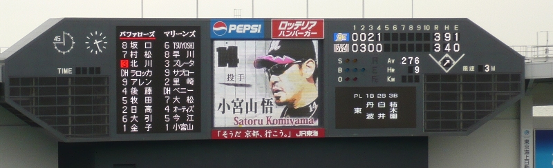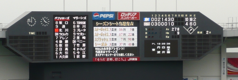 今年のマリンスタジアム観戦納め(予定)。 予告先発から乱打戦になると思っていましたが、予想通り一方的な展開でしたね。 ロッテ 4-10 オリックス 今江のツーランなどで3点先制したものの、あっさり同点。 清水は気負い十分と見えたんですが・・・、後藤は振ればヒット・ホームランと大活躍。 ブキャナンとか後藤とか清水から打ちすぎ。というか清水が抑えているバッターのほう が少ないか。 清水降板後は豪華負けリレーを堪能させていただきました。 小宮山は10連戦前半に好リリーフをみせた反動ですな。orz しかし、バ監督の荻野の起用方法が分かりません。勝ち試合のセットアッパーだと思って いたんですが、どうなんでしょう。 2007年マリン観戦はロッテの1勝4敗1雨天中止(OP戦1敗含)でした。がっくりです。 PR