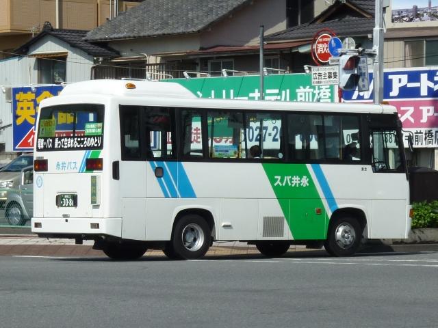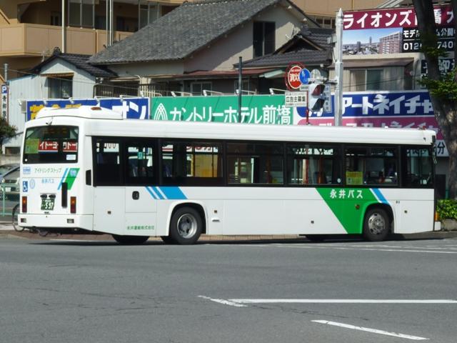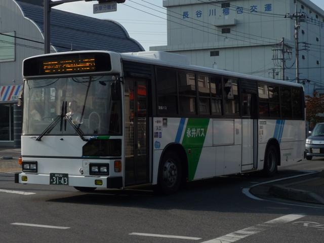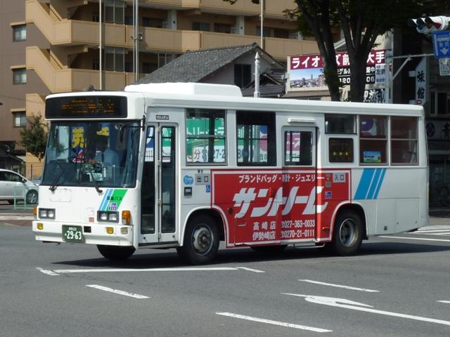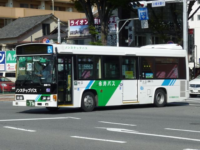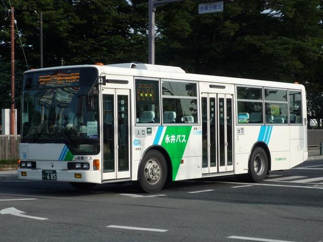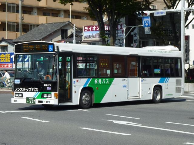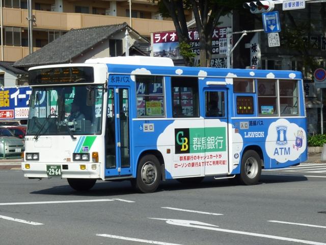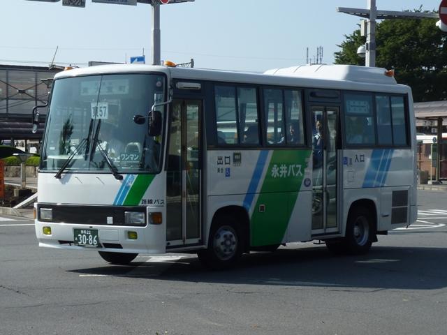 先日群馬県の前橋へ出かけました。前橋は少なくとも年に1回は所用で出かけるところ ですが、今年は来訪機会が多いようで、梅雨時期以来2度目の訪問となりました。 今回は「前橋で見たバスその3」ということで、特に様々な車種を記録することが出来た 永井バスこと永井運輸の乗合バス画像を小型→中型→大型の順に並べていきます。 永井運輸は元々トラックによる運輸事業からスタートした事業者です。その後タクシー・ 貸切バスと事業を拡大し、1993年に廃止代替バス運行によって路線バスに参入しま した。塗装はタクシーなどと共通の白地に緑と水色のラインの爽やかなものとなってい ます。ちなみに今回並べる一部の車両は、2010年編その2と重複しているものもあり ますが、せっかく記録できたと言うことでご容赦を。もしご覧になられてない方、忘れてし まった方は、御参照いただければ幸いです。 なお、型式・年式は「永井運輸 所有車両44台全データ」『バスマガジン21号』(2007), 三推社/講談社 を参照しました。 <小型車> 群馬200え333. まずは前橋市のコミュニティバス「マイバス」西循環線で活躍する新ポンチョ。 画像の333と777の2台が専用車両として運行しています。関越交通運行の「マイバス」 と同車種ですが、塗装デザインは異なります。 群馬22あ3086.KC-RH4JEAA(97年車)。 永井運輸は93年の廃止代替バス参入にあたり、7mサイズの日野RHを3台導入。 画像のRHは97年に増備されたKC規制車。既にワンステップのRNが販売を開始して おり、KC規制車のRHを乗合車で導入した事業者は熱心な日野ユーザーを除けば少 ない印象。 <中型車> 群馬22あ2963.KC-LR333F(96年車)。 乗合車は日野車中心の永井運輸ですが、96年の代替バス運行にあたって導入された のは「いすゞ」のLR短尺車。まずは群馬の路線バスでおなじみのサントノーレ 広告を貼 り付けた車両。 群馬22あ2964.KC-LR333F(96年車)。 LRの短尺車は4台在籍。LRは担当路線の関係なのか、ラッピングや広告を貼り付けた 車両が多数。 群馬22あ3290.KC-RM211GAN改(99年車)。 永井運輸初のノンステップ車は西工ボディのUD。永井運輸は4メーカー在籍しています。 前回並べたときとの相違は、交通安全ラッピング車となっていたこと。 群馬200か398.KK-HR1JKEE(03年車)。 ノンステップ車の増車は日野HR9m。まずはKK規制車。 群馬200か521.PB-HR7JHAE(05年車)。 国交省仕様ノンステップ車となった05年導入車。04年導入車は2010年編その2を参 照のこと。 群馬200か597.PK-HR7JPAE(06年車)。 06年導入車は10.5mサイズへ。リヤ側も記録できたので並べておきます。 <大型車> 群馬22あ3143.KC-HU3KPCA(97年車)。 01年より運行を開始した前橋大島駅線、こちらは廃止代替バスではなく自主運行路線と のこと。通学路線ということで大型車が活躍していますが、土日祝日並びに夏・冬・春休み 期間中は運休と完全に利用者の需要にあわせたダイヤとなっています。この割り切り方が 無ければ、マイカー王国の群馬ではやっていけないということなんでしょう。 まずは日野の長尺車。視野確認窓に高出力エンジン、エアサス車とこだわり車です。 群馬200か685. こちらはバスマガジン掲載以降に登場した中扉4枚折戸のニューエアロスター。元は従 業員送迎の自家用だった車両とか。前橋大島駅線は7月末を除けば2台運用のダイヤ となっており、訪問日は画像の2台で運行していました。元都営バスの日野車はこれで 代替されたのでしょうか。 PR