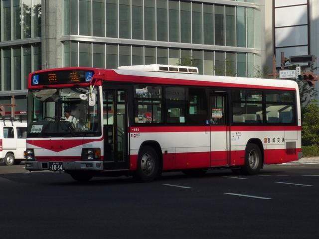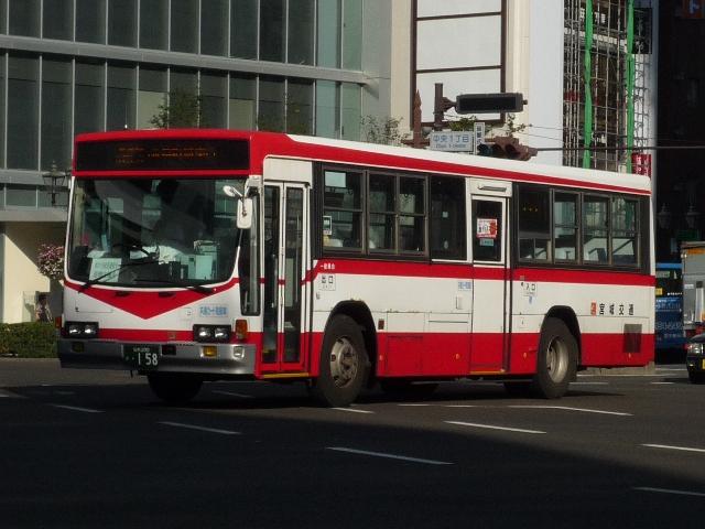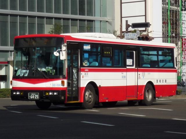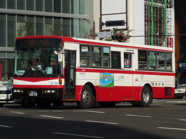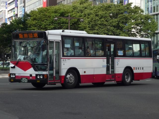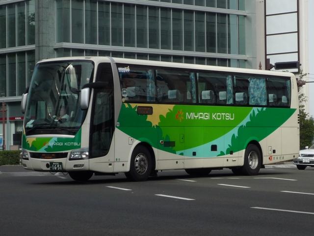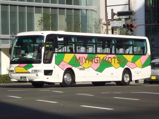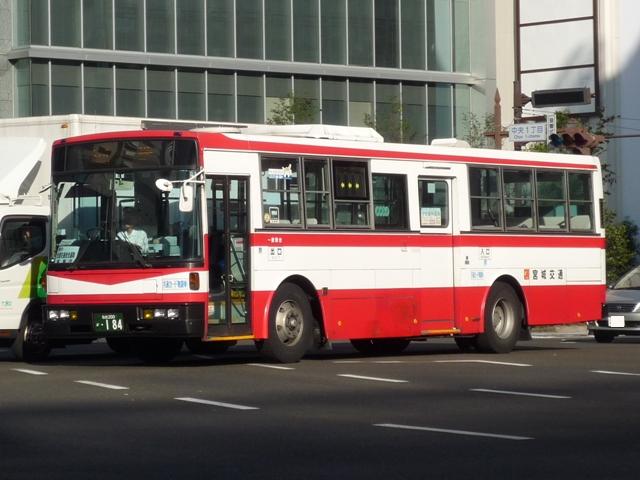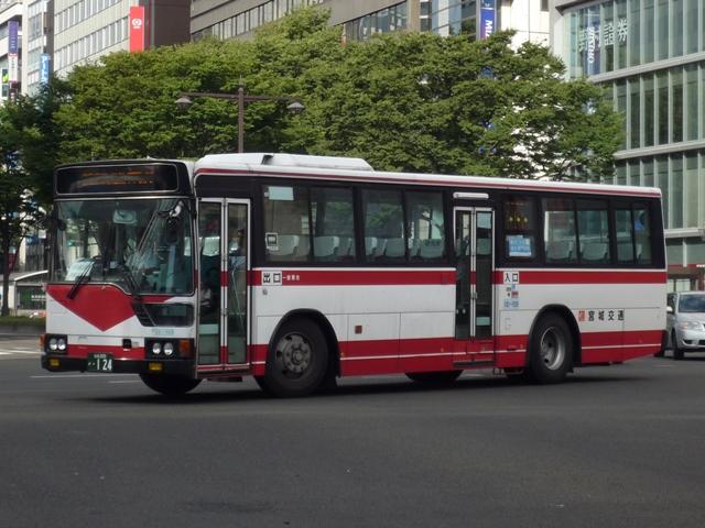 福島まつりへ出かけた際に見たバス画像よせ集め。福島へは行程の関係で仙台を経由 して行くことにしました。仙台にいたのは短時間でしたが、今回は記録できた宮城交通の バスを並べていきます。 宮城交通はその名の通り宮城県内全域(子会社含む)に路線網を持つ名鉄グループの 事業者です。戦後統合で宮城県は4ブロックに統合されましたが、一部の鉄道・軌道会社 が除外されたこともあり、戦後のバス黄金期は各社で路線競合する状態となりました。し かし、マイカーの普及と過疎化で軒並み経営が悪化、徐々に合併・吸収が進み、1970年 に「宮城交通」が成立しました。 統合後も経営不振は続き、この際に名鉄の資本参加を受けグループ入りします。1990年 代以降末端部を中心に地域分社が進められ、のちにミヤコーバスとして統合。宮城交通本 体も関連事業の問題から事業会社設立・統合と幾度か経営体制が変化しています。 そんな宮城交通の在籍車両ですが、4メーカー揃い、それに移籍車も含まれることから多 種多様な状況となっています。 <日野車> 宮城200か1263. 名鉄グループということで、塗装デザインは1970年代の名鉄カラーをアレンジしたものと なっています。 まずは日野車。自社発注のブルーリボンⅡワンステップ車。フロントのエンブレムが無けれ ばエルガと判別困難なPJ規制車。仙台では短時間の滞在だったこともあり、記録できた日 野車は残念ながらこれだけ。 <いすゞ車> 宮城22か6070.U-LV224M(93年車)※2。 続いていすゞ車、富士ボディの標準尺車。宮城交通のいすゞ車は純正ボディと富士ボディ が在籍しています。ちなみに自社発注の大型乗合車がエアサス車で導入を開始したのは 画像の93年車から。 宮城200か158. こちらは純正車体のキュービック。自社発注車両台数でいすゞ車は多いものの、移籍車 は何故か少なめ。見た車両は全て自社発注車両でした。 宮城200か432. エルガの初期車。ミラーの取り付け位置に特徴があります。 宮城200か1064. こちらはありふれたミラーの取付位置となっています。 <UD車> 宮城22か6425.KC-UA460LAN(95年車)※1。 仙台市交通局から路線移管にあわせて移籍した車両。側面逆T字窓に色つきガラスと宮 城交通らしからぬ仕様となっています。 宮城200か438. 宮城交通といえば一時期西武バスから大量の移籍車を導入し、県内全域で活躍する姿 を見ることが出来ました。現在も長いものから短いものまで、まとまった台数が活躍中。 画像は最も見かける標準尺の車両。 仙台200か184. 仙台ナンバーの西武移籍車も在籍。最近の導入した車両なのか営業所転籍車か分から ず。UD車は西武移籍車の関係で、いすゞ車とは逆に自社発注車両の方が少ない状況。 <三菱ふそう車> 宮城200か1323. 名古屋周辺が自動車NOx・PM法の対策地域となったことで、名鉄グループ全体で多量 の廃車が発生。これまで経年車が多いことから、移籍事例も少なかった名鉄の車両が全 国のグループ各社に振り分けられることになりました。宮城交通にも様々な車両が転入し、 前面のみを塗り替えたエアロスターがあっという間に幅を利かすことになりました。まずは 名古屋空港路線で活躍していた窓下の帯が細い車両。行先の文字やロゴを剥がした結果、 無駄に白さが目立ちます。 仙台200か83. こちらは一般的な名鉄のバスだった車両。ボディ下部の赤帯2本が宮城交通導入車両と の違い。もっとも名鉄グループ入り直後の宮城交通では位置がだいぶ異なりますが、ボ ディ下部の赤帯は2本でしたので、先祖帰りともいえるのでしょうか。中扉4枚折戸仕様。 仙台200か124. こちらは中扉折戸の車両。網走や岐阜で広く見られるグループです。 宮城200か1651. 続いて高速車ですが、記録していた位置の関係で画像は1枚のみ。自社発注の新鋭車 になるのでしょうか、現行エアロクイーンの夜行車。 かつての宮城交通の三菱ふそう車といえば高速車・貸切車が中心で、一般乗合車は神 奈川中央交通の移籍車が在籍する程度でした。もっとも高速車も名鉄からの転籍車が 在籍し、むしろ路線車よりも名鉄そのままの塗装で活躍しています。以前郡山で記録し たものはこちら。 宮城22か6857.KC-MS829P(98年車)※2。 なんだかゴテゴテ感のあるカラーは貸切車。塗装デザインは「青葉城」の石垣をモチーフ とし、色にも意味がこめられているとか。ゴテゴテと言ってスミマセン。 なお、型式・年式は以下の文献を参照しました。 ※1)「仙台市交通局車両一覧表」『バスマガジン7号』(2004),三推社/講談社 ※2)『BJニューハンドブックス No.29 宮城交通』(1999)BJエディターズ PR