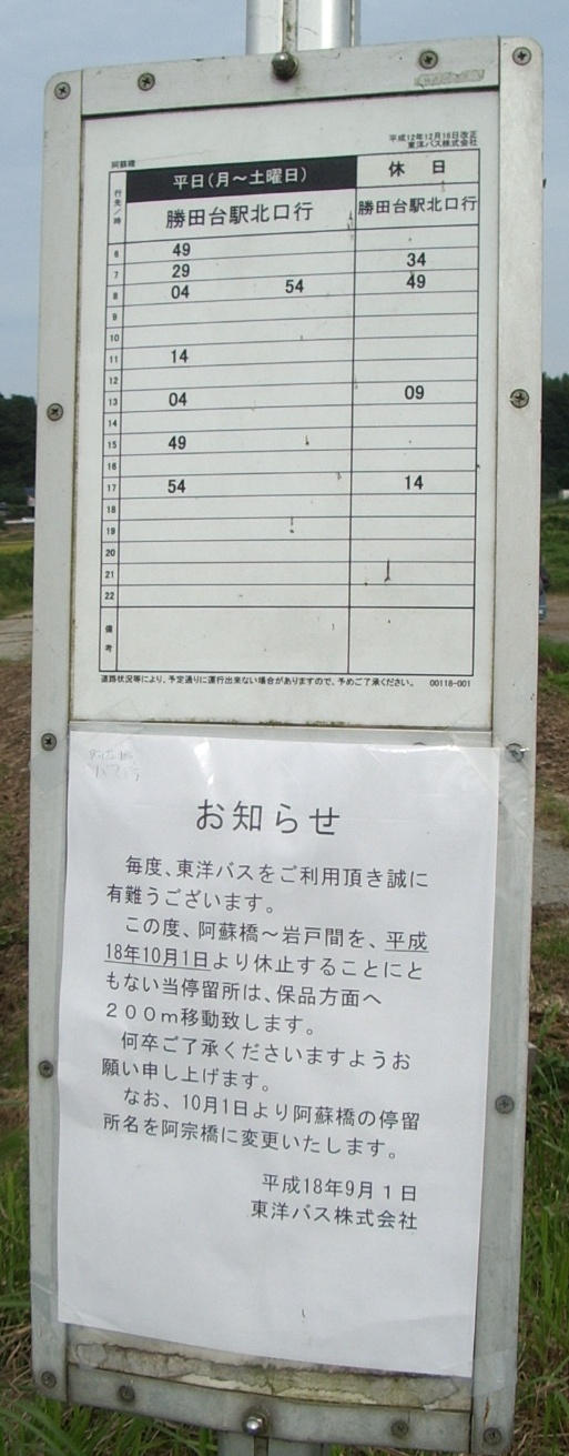約1年前まで、東洋バスには「岩戸」という印旛村の集落までの路線がありました。 岩戸停留所で帰りのバスを待つ間、道路はひっきりなしに車が行き交うのを見て岩戸には それなりの交通流動があることに気づきました。この地にかつて阪東自動車も路線を持っ ていたことからも、それなりの要所だったのかもしれません。しかしマイカーがこれだけ普 及した現状では、1時間に1本あるかないかの路線バスでは多様化した需要を満たすこと は難しい状況になってしまったのは事実。印旛村からの補助金打ち切りで阿蘇橋~岩戸 間は2006年9月一杯で休止になりました。 阿宗橋まで存続したのは八千代市からの補助金は継続したため。確かに2005年乗車し た際、八千代市内は途中にある小学校の下校時間と重なり、それまでガラガラだった車内 が児童で席が埋まるくらいの利用がありました。路線短縮後は乗車していないのではっきり と言えませんが、ある種八千代市スクールバスとしての存続しているという状況ではないか と思います。現在も岩戸まで休止のままなのか分かりませんが、おそらく復活する事は無い でしょう。1度乗るくらいのマニアのノスタルジーで路線存続が出来ないことは分かっていま すが、東洋バスの岩戸を含め味のあるバス路線がどんどん廃止になる状況は残念でなりま せん。 岩戸降車専用ポール。なつかしいポールが残っていました。 印旛中学校行きの文字が泣けます。こういうのが残っていることがあるので、路線バス の終点までの乗車旅(←大げさ)はやめられません。 PR