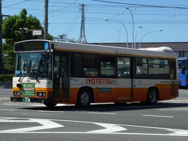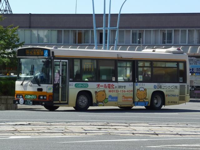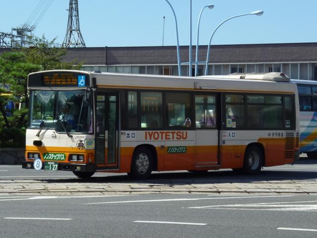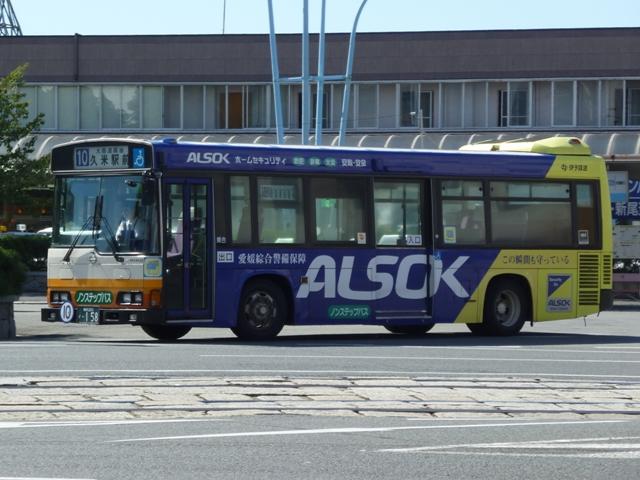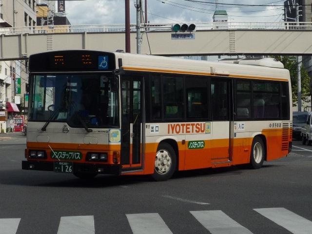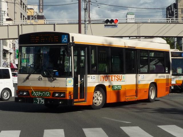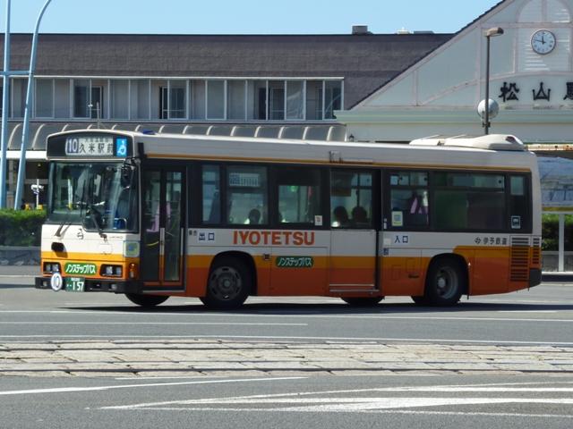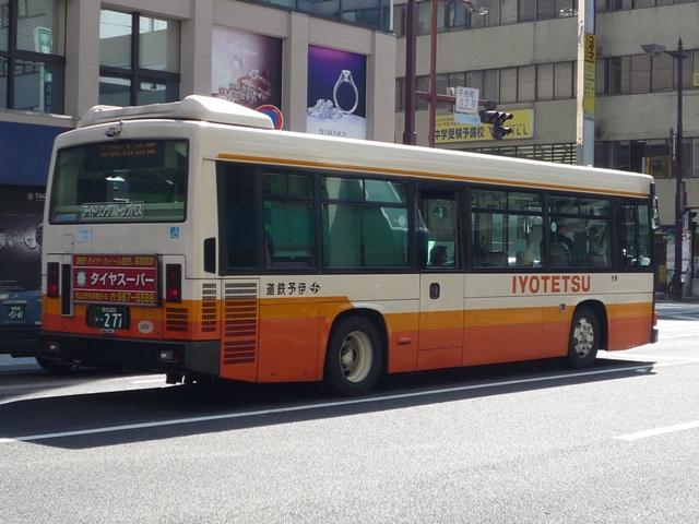 松山で見たバス画像よせ集め。伊予鉄道編その3ではこれまで通りの微妙な書体で登 録した「愛媛」200かナンバーの乗合車画像を中心に並べていきます。 なお、型式・年式は「伊予鉄道グループ 在籍車両一覧」『バスラマインターナショナル87 号』(2004),ぽると出版を参照しました。 愛媛200か126.KK-HR1JKEE(00年車)。 ノンステップ車は伊予鉄道の「サービス向上宣言」の一環として導入を開始。中扉上部に スピーカーを装備しているのが特徴。以後、一般乗合車はノンステップ車を導入している ため、松山市内中心部ではHRばかりの印象。画像の00年車は行先表示をLEDに改造 しています。